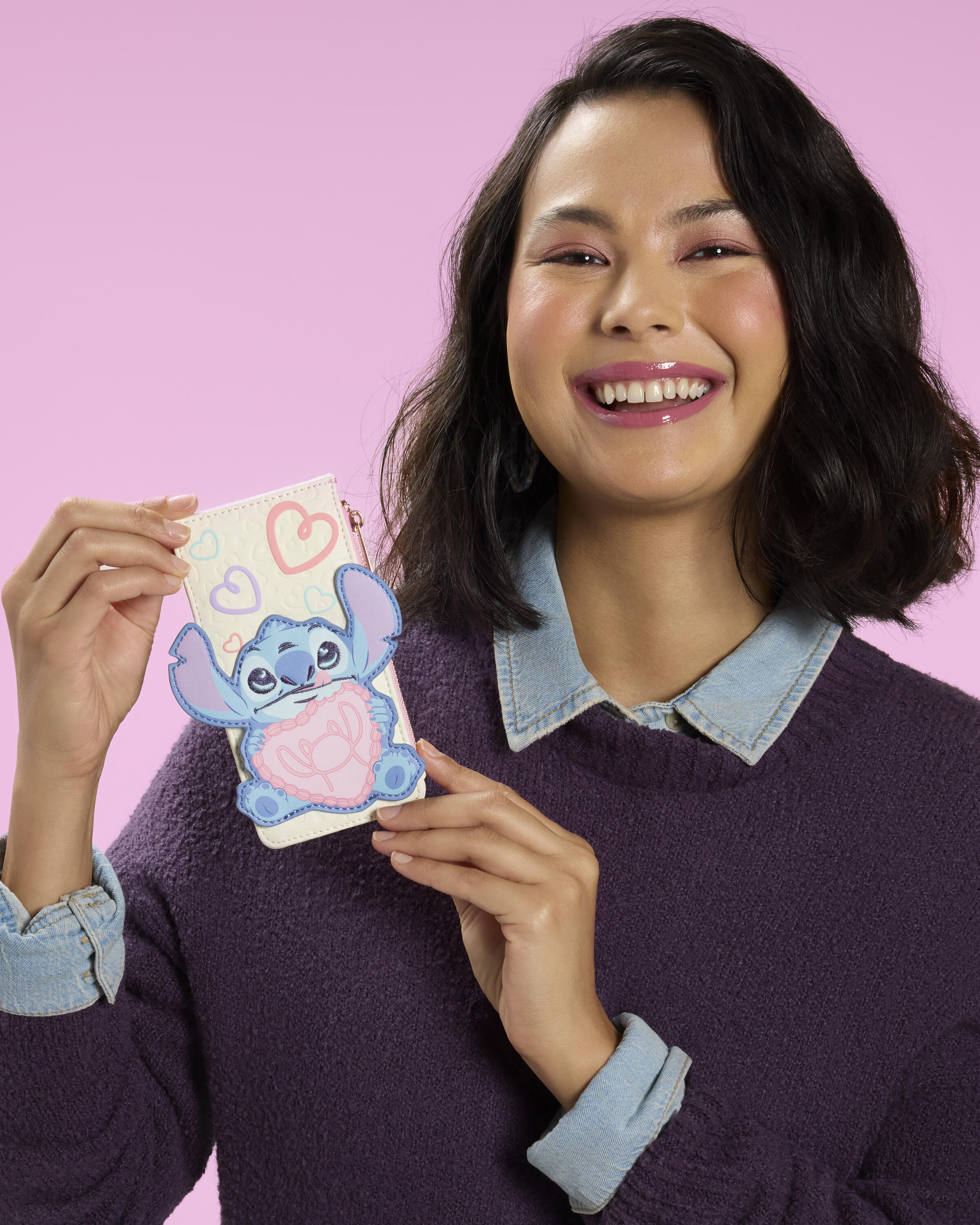 Get ready for Valentine's Day season with this adorable Stitch card holder. You'll find Stitch on the front holding a heart-shaped cake that has Angel's silhouette piped onto it. You'll find a debossed pattern of hearts all over the front and back of the card holder, as well as puff print hearts! Turn it around to find four pink-and-blue card slots.