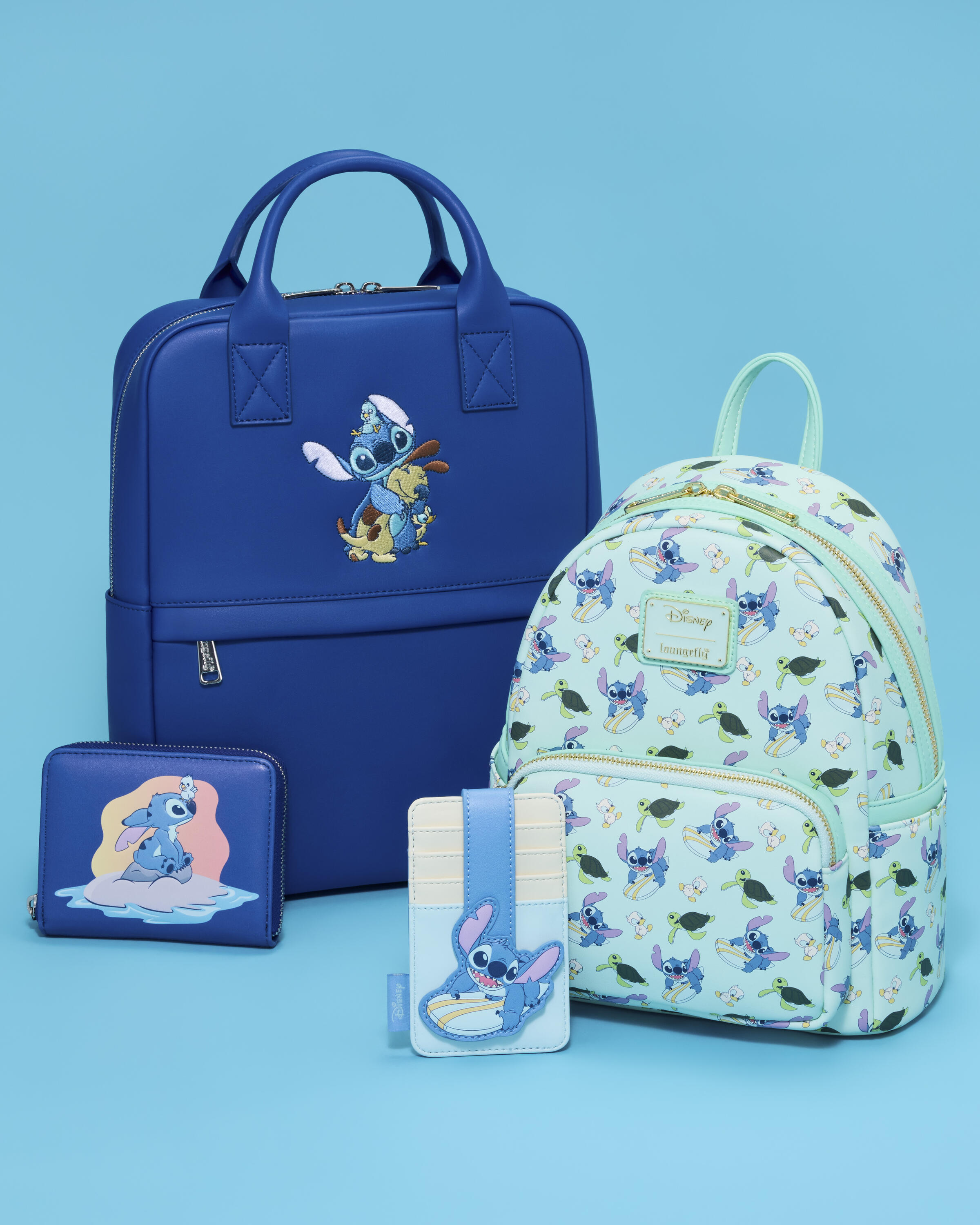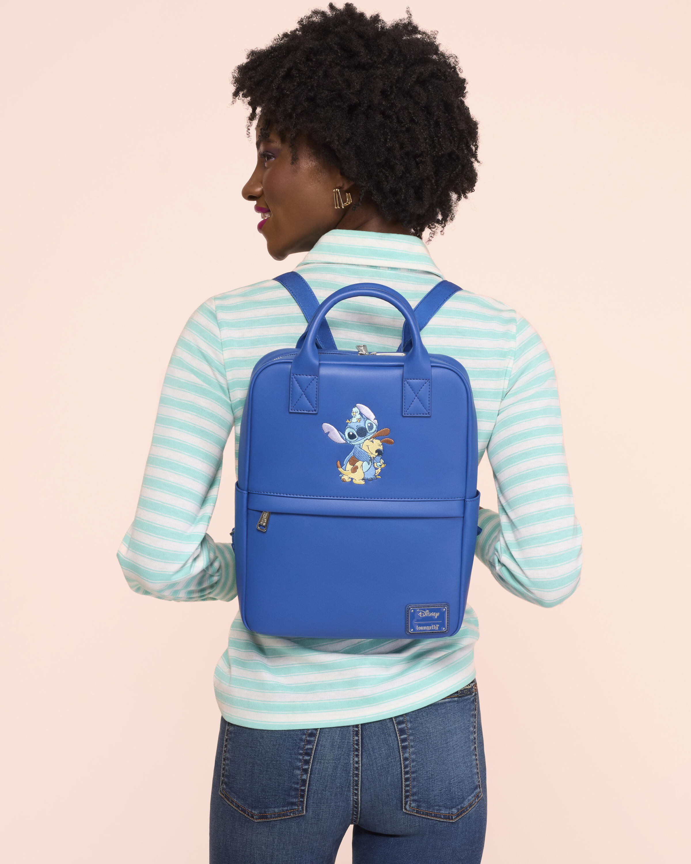 This mid-size backpack is blue and features printed details of Stitch hugging some animal friends, like a dog, a duckling, and a bird. You'll find a zippered front pocket and side drop pockets in addition to the main zippered compartment. It's ready to hold your essentials on any adventure!