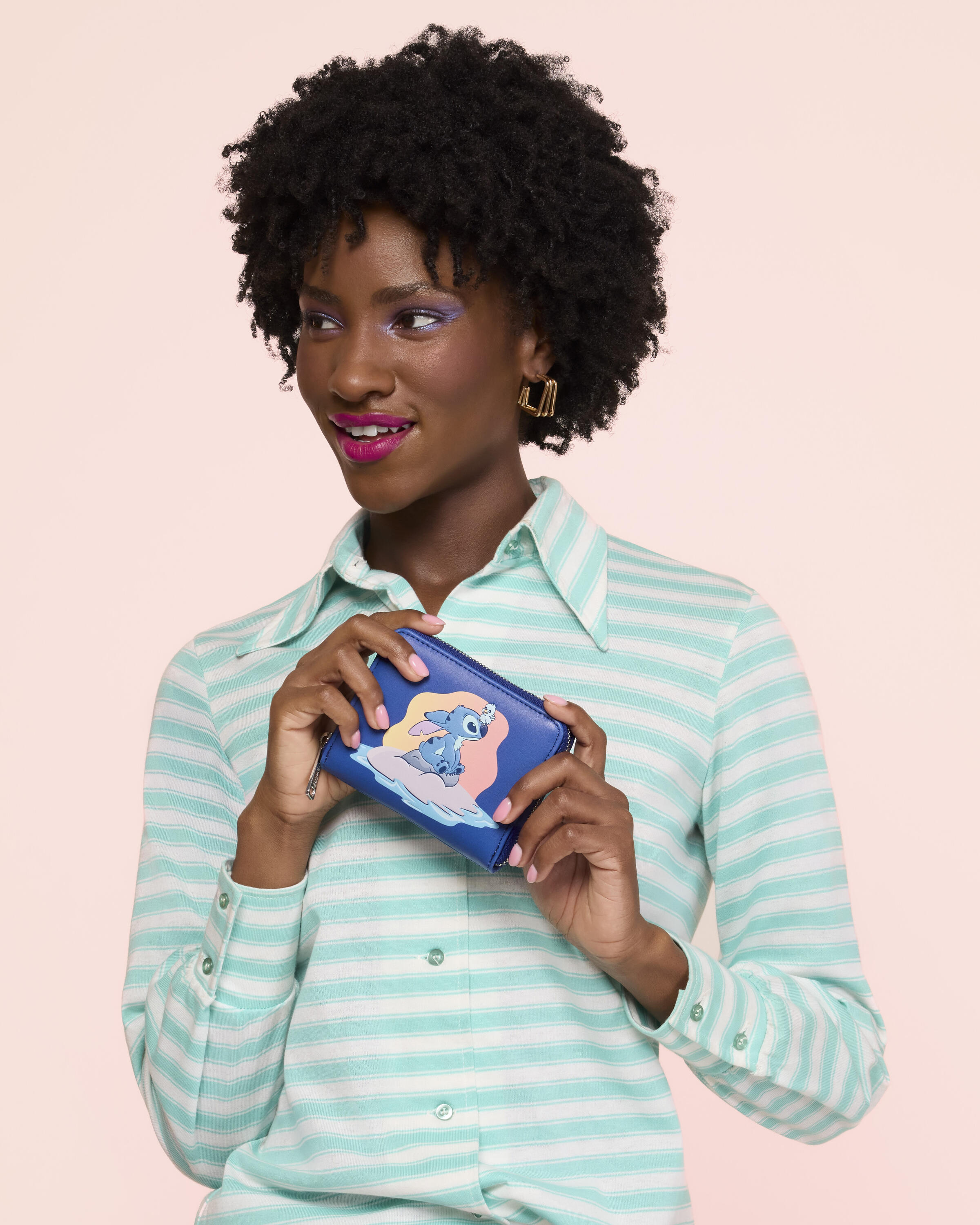 This zip around wallet features Stitch sitting on a rock with a bird resting on his head. A sliver of sunset is visible behind him. Turn the wallet around to find another image of Stitch with the bird. Inside, there are four card slots and one clear ID slot. It's a super cute accessory for any Stitch fan to have throughout their day!