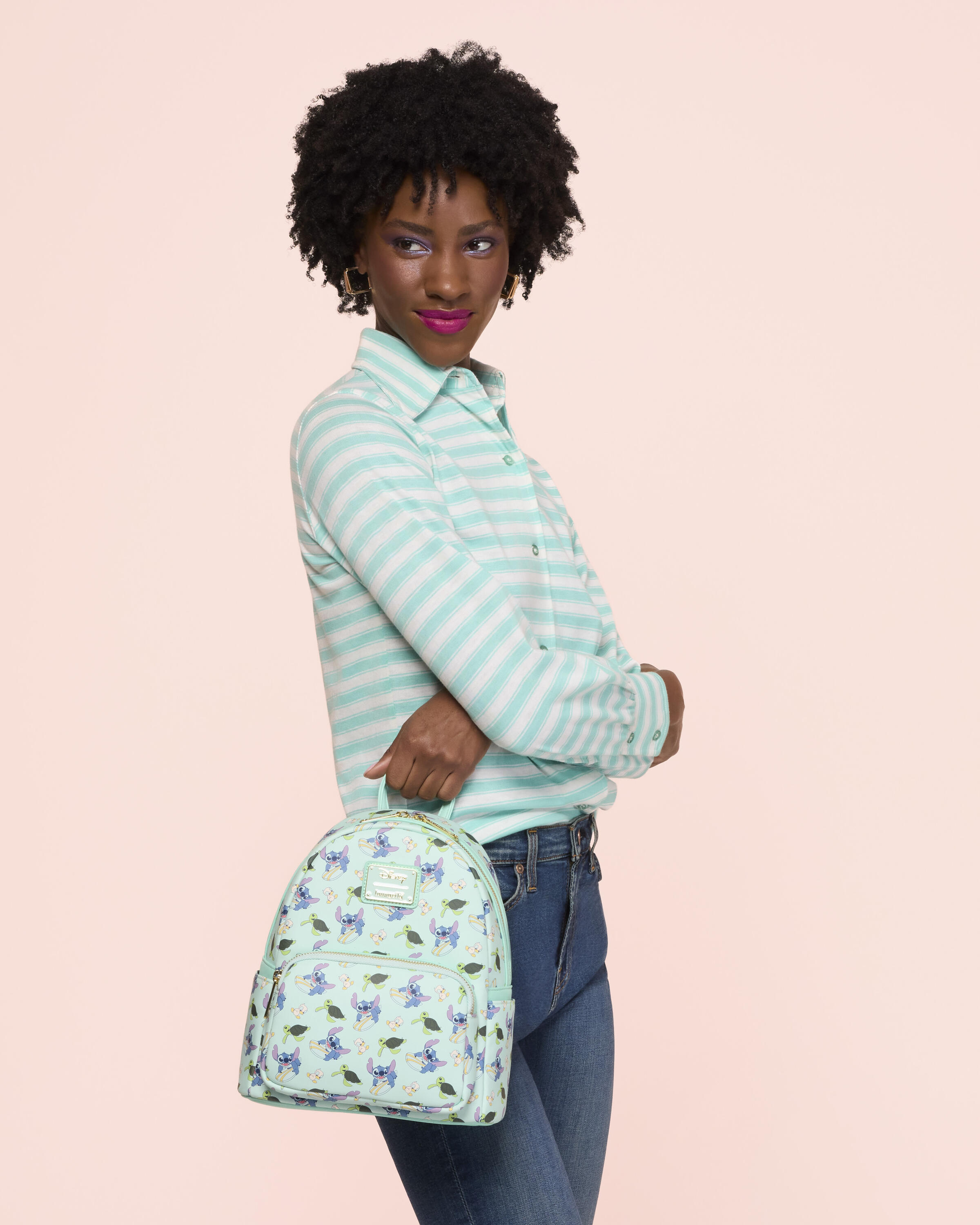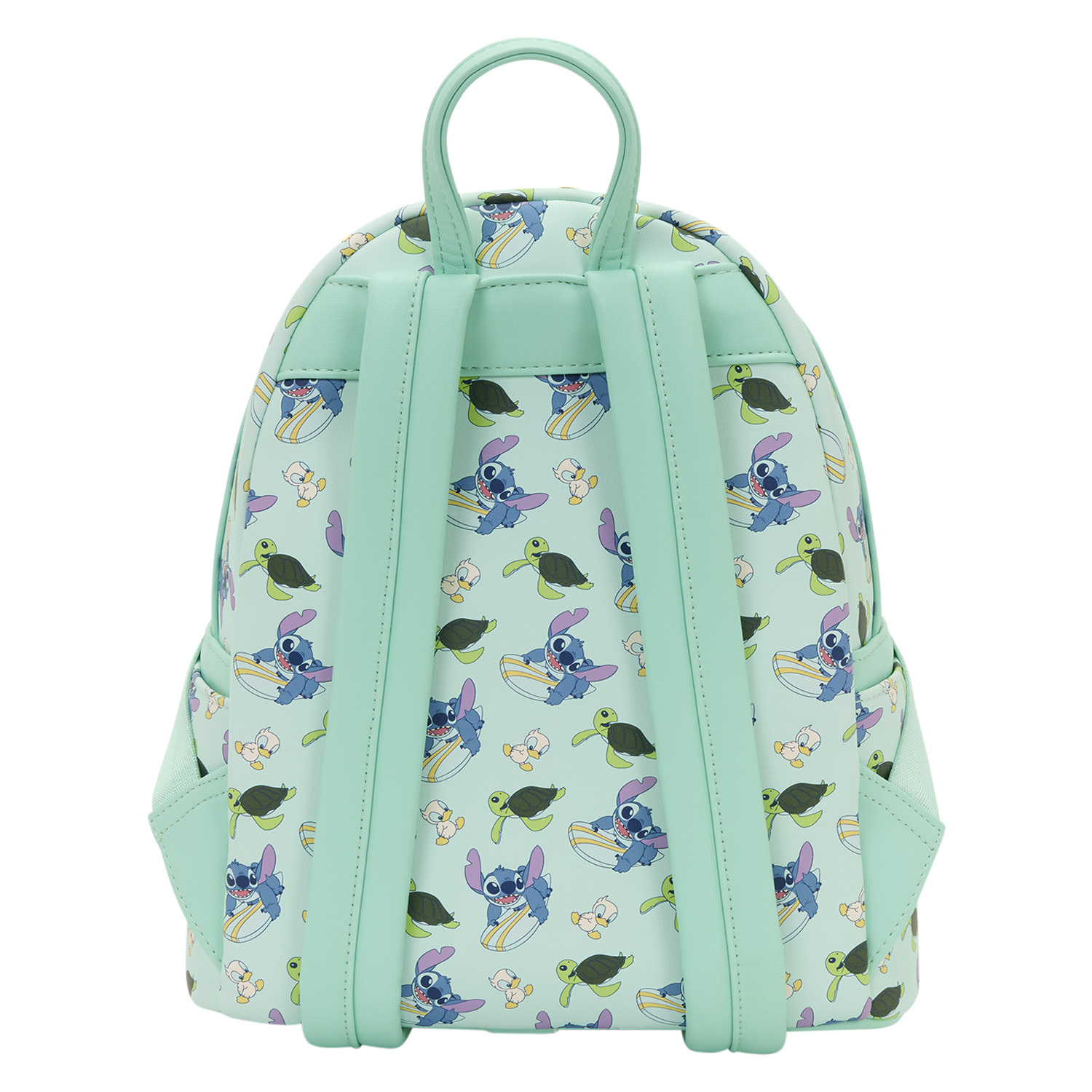 This mini backpack features an all-over print of Stitch on a surfboard, ducklings, and sea turtles! Look closely and you'll find duckling appliques on the straps! It's a super cute bag that shows off your love for Lilo & Stitch and is ready for any adventure!