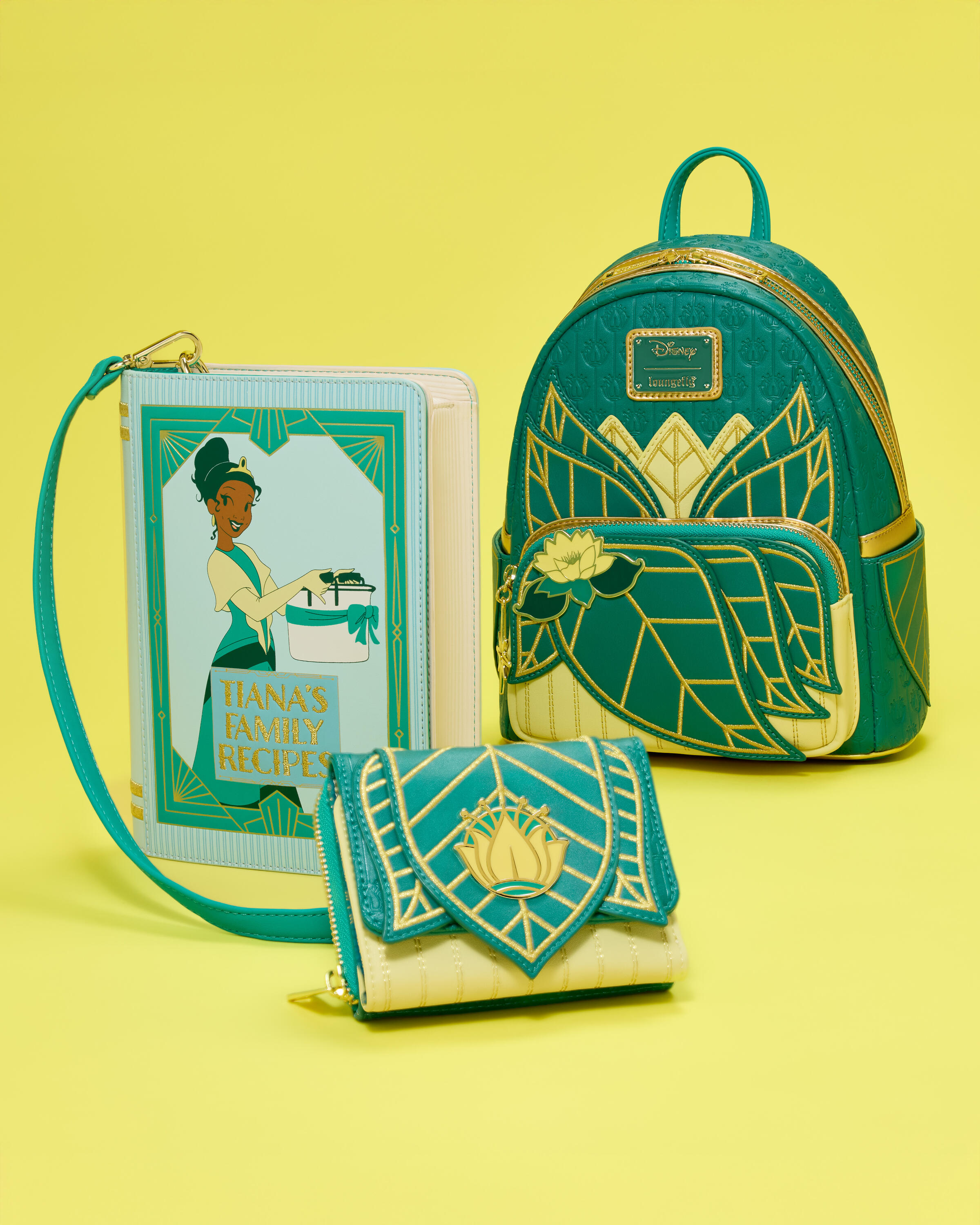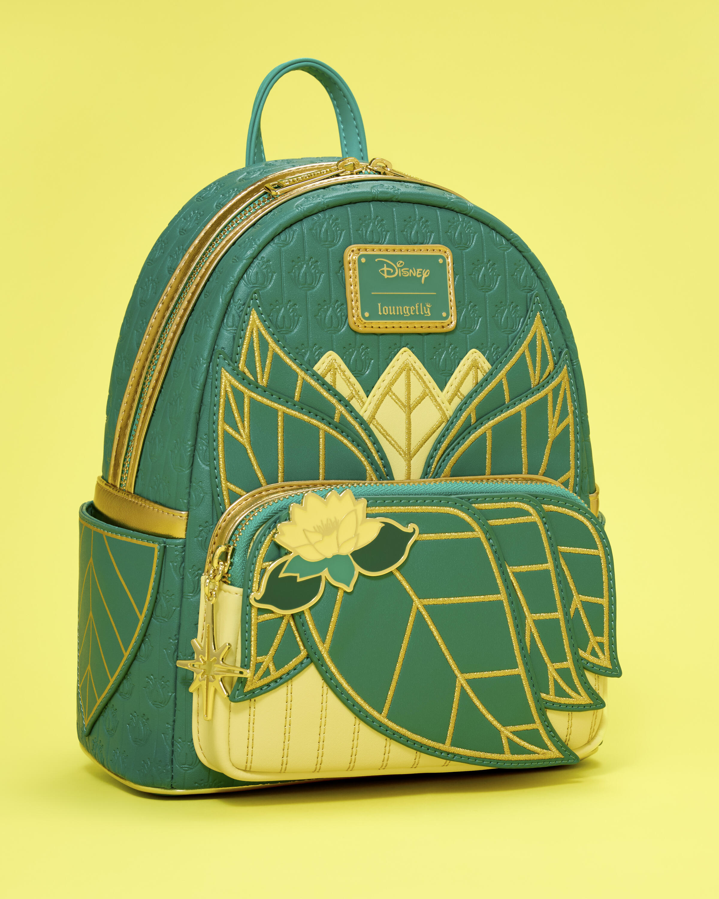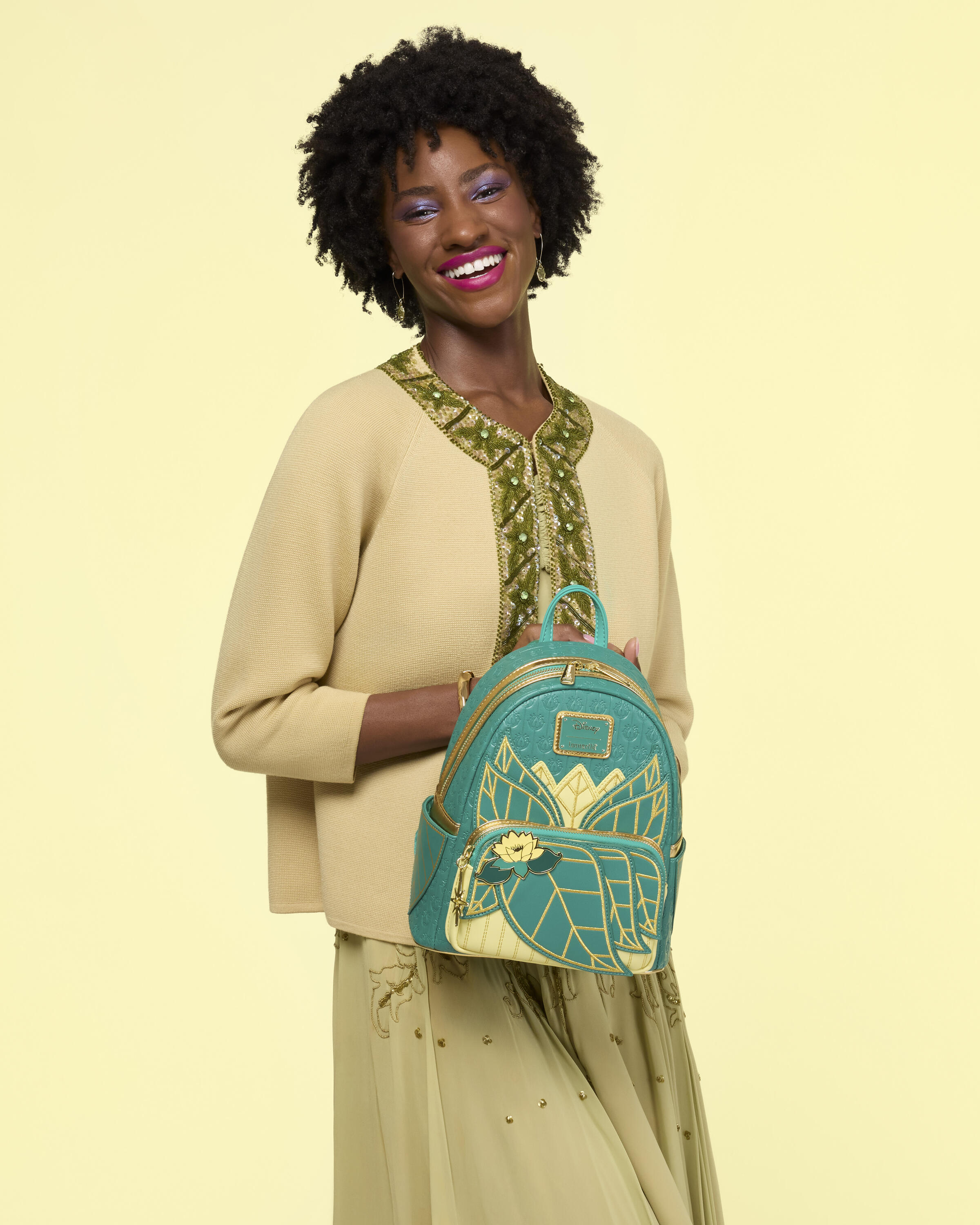 This mini backpack is inspired by Princess Tiana's green dress. You'll find metallic gold embroidery, enamel fill rivet, and debossed details. Leaf details cover the side pockets, and you'll find more debossing on the straps. Inside, you'll find a pretty lining featuring Tiana that coordinates beautifully with the rest of the bag!