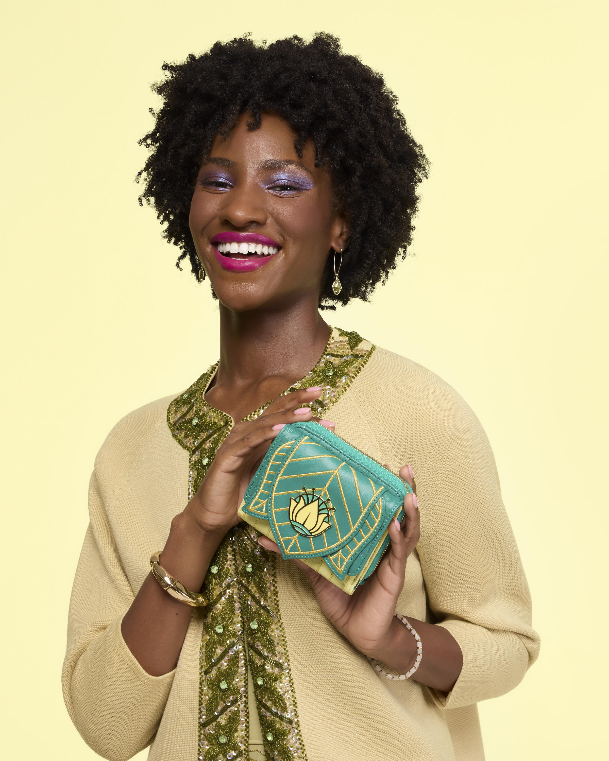 The design on the wallet looks like Tiana's green dress. You’ll find metallic gold embroidery, debossing, and an enamel fill rivet in the shape of her crown. Inside, there are four card slots and one clear ID slot. Take a close look at the inside flap and you'll find Princess Tiana's signature!