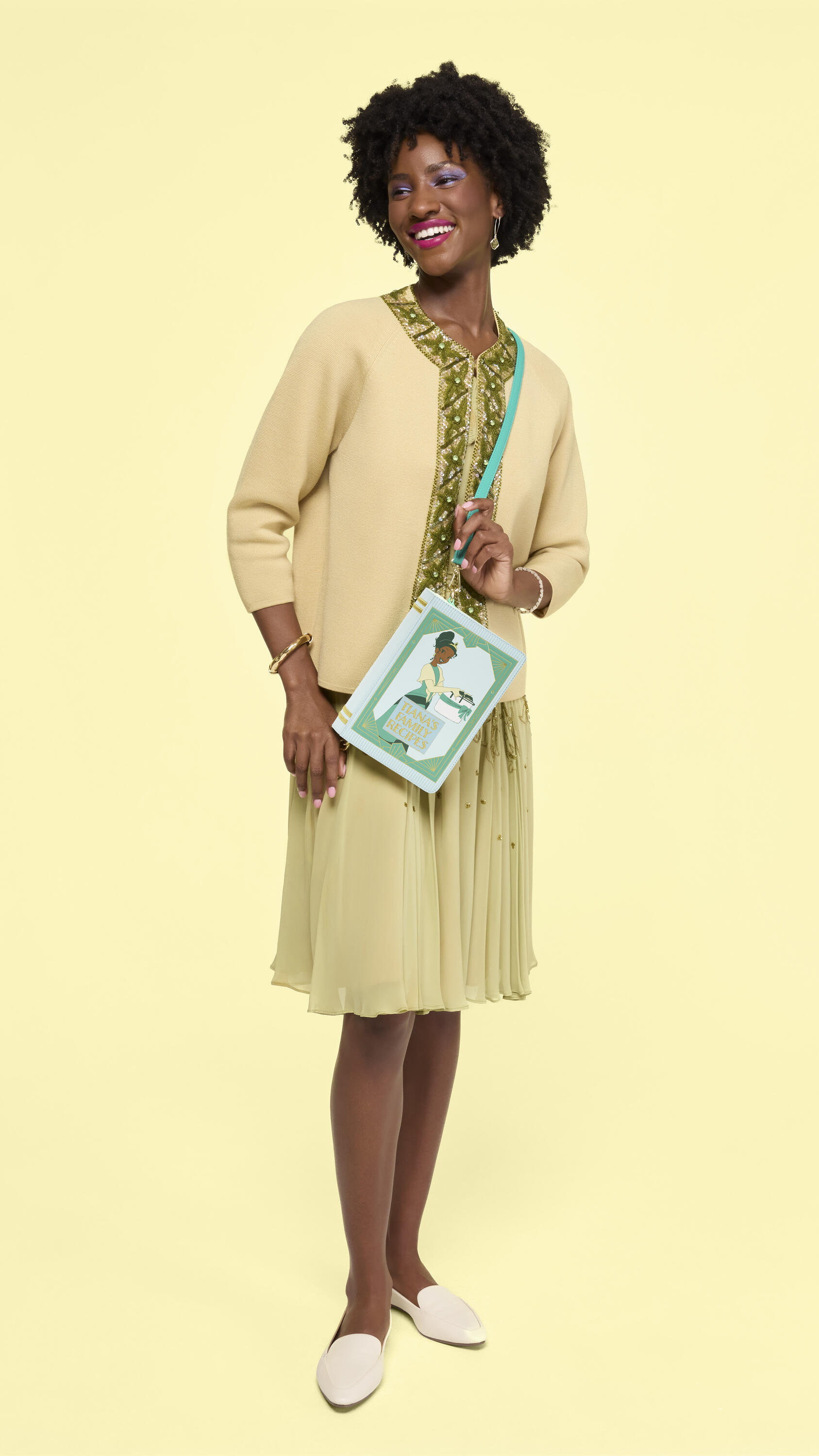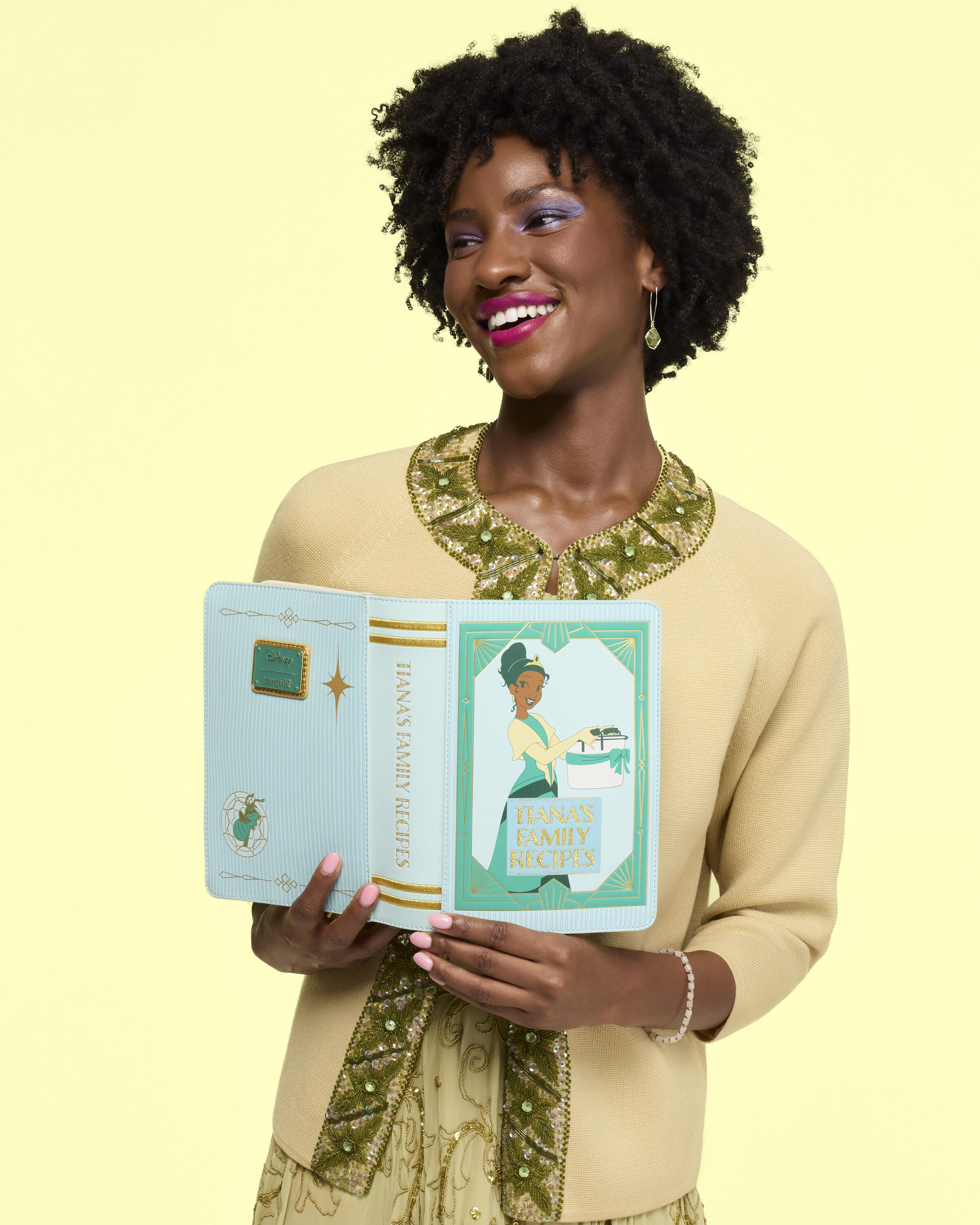 This crossbody bag is in the shape of Tiana's recipe book! You'll find an image of her on the cover with the title, "Tiana's Family Recipes" written in golden embroidery. Turn the bag around to find an image of Ray and gold foil designs! You can even open the front cover to find the title page with debossed details of Tiana and the title written out again!