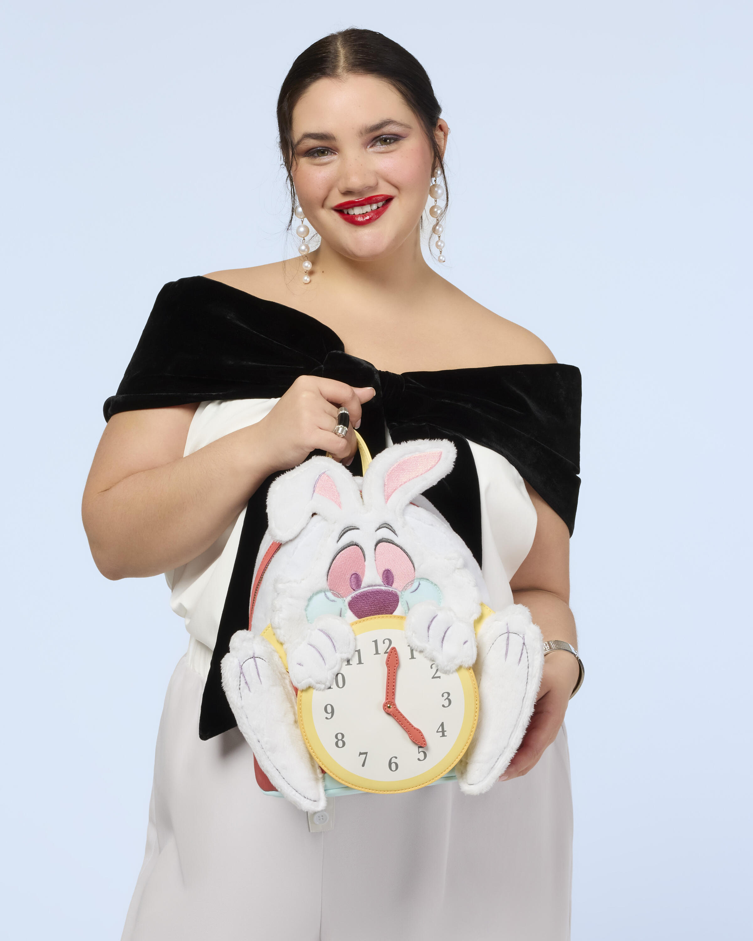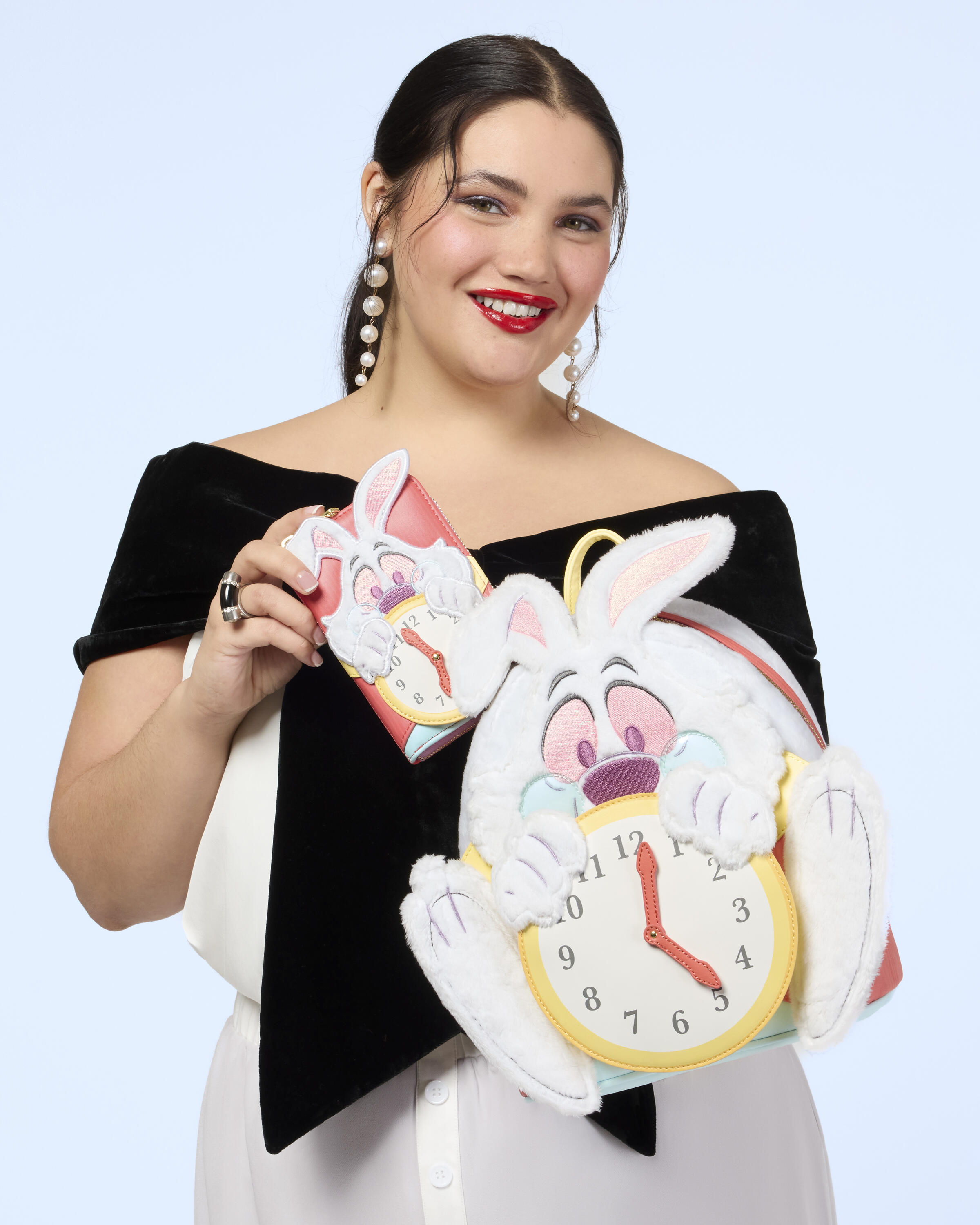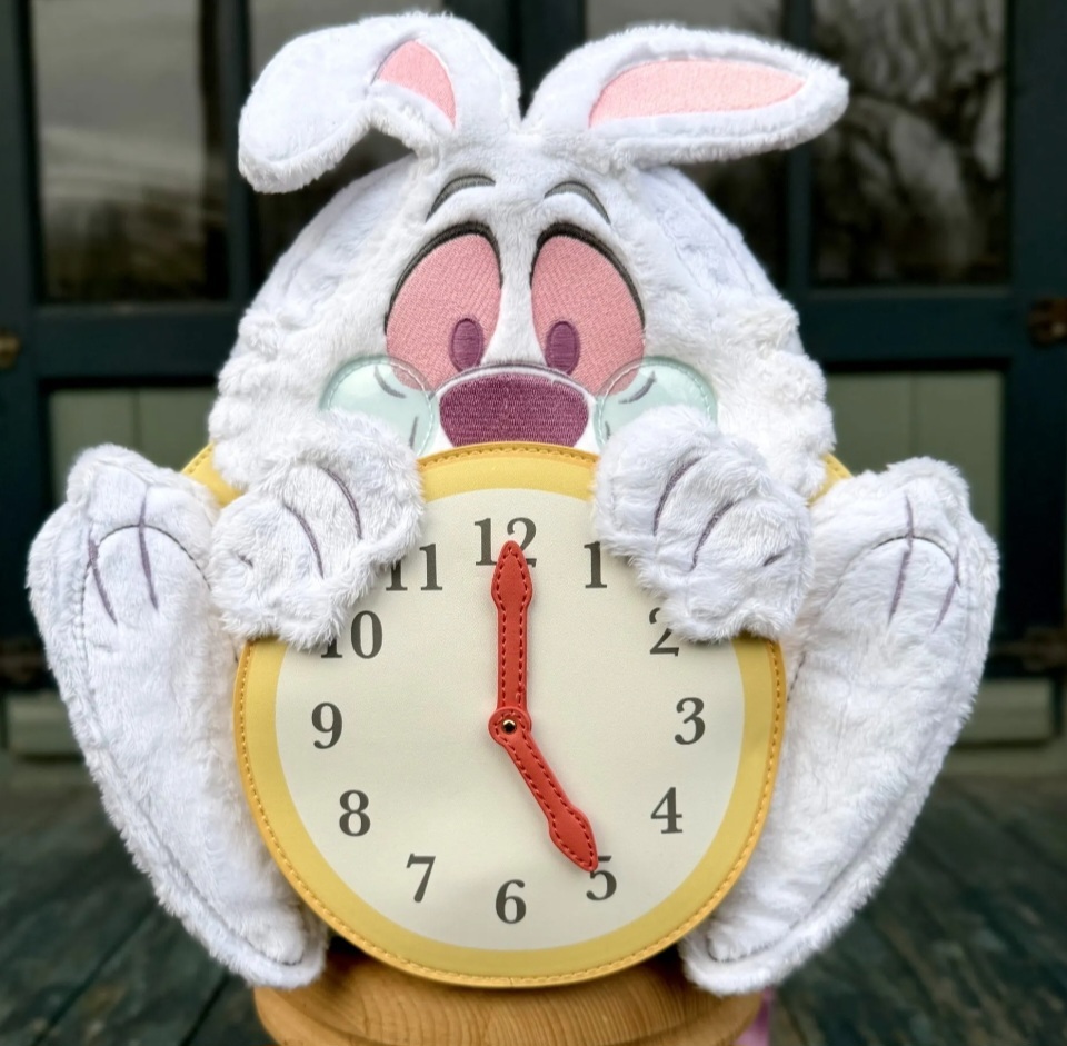 This mini backpack is ready for any important date! It features the White Rabbit from Disney's Alice in Wonderland. You'll find faux fur, embroidered facial details, PVC, and plush details on the bag to bring the rabbit to life. He holds a clock, and the hands spin on a rivet! Fall down the rabbit hole of style!