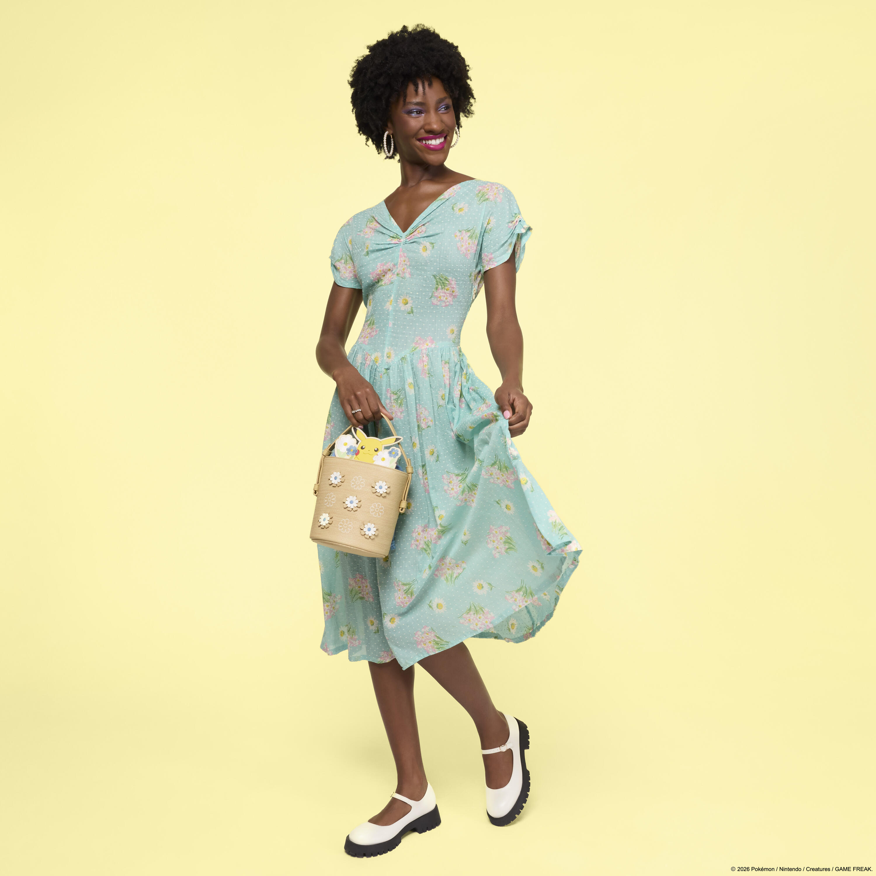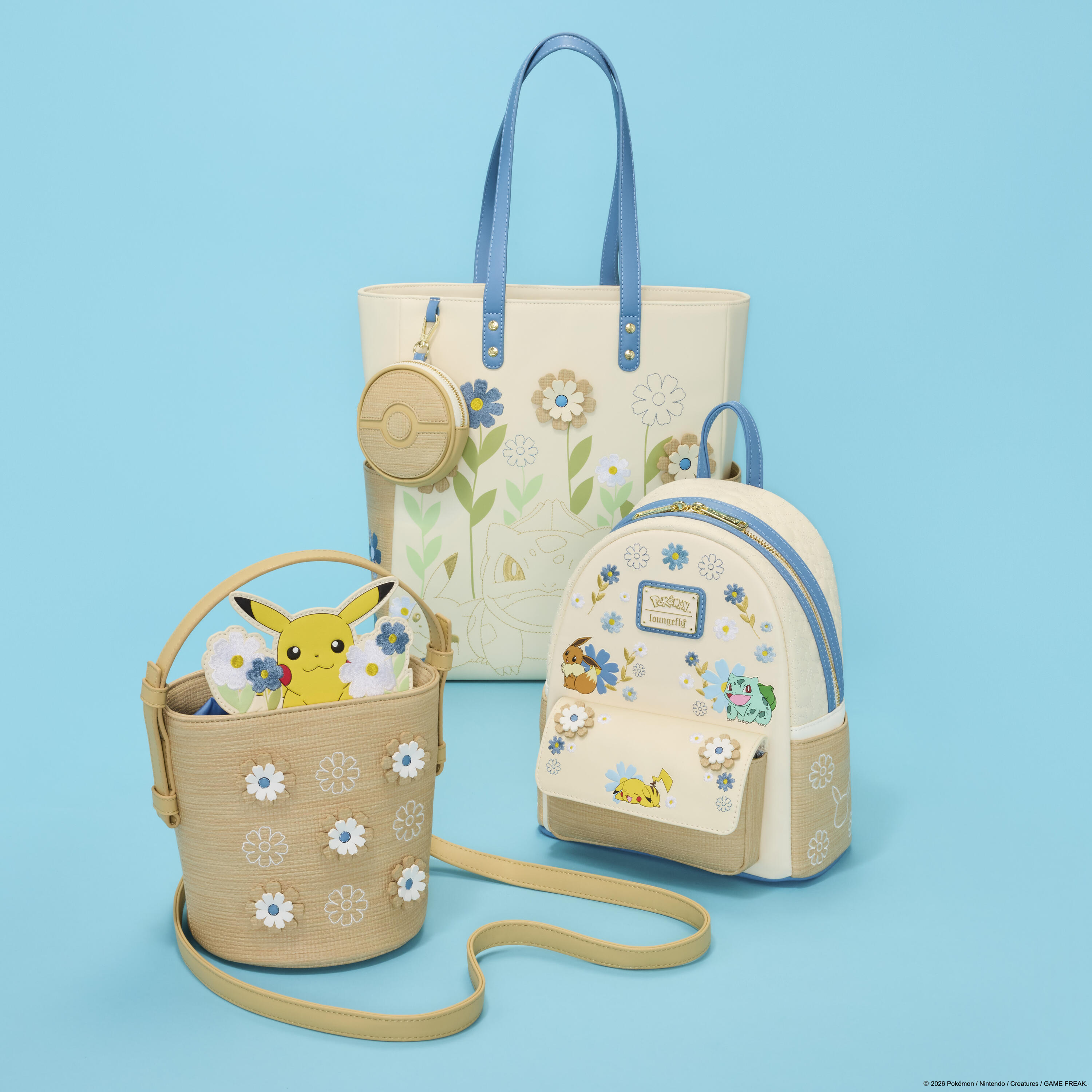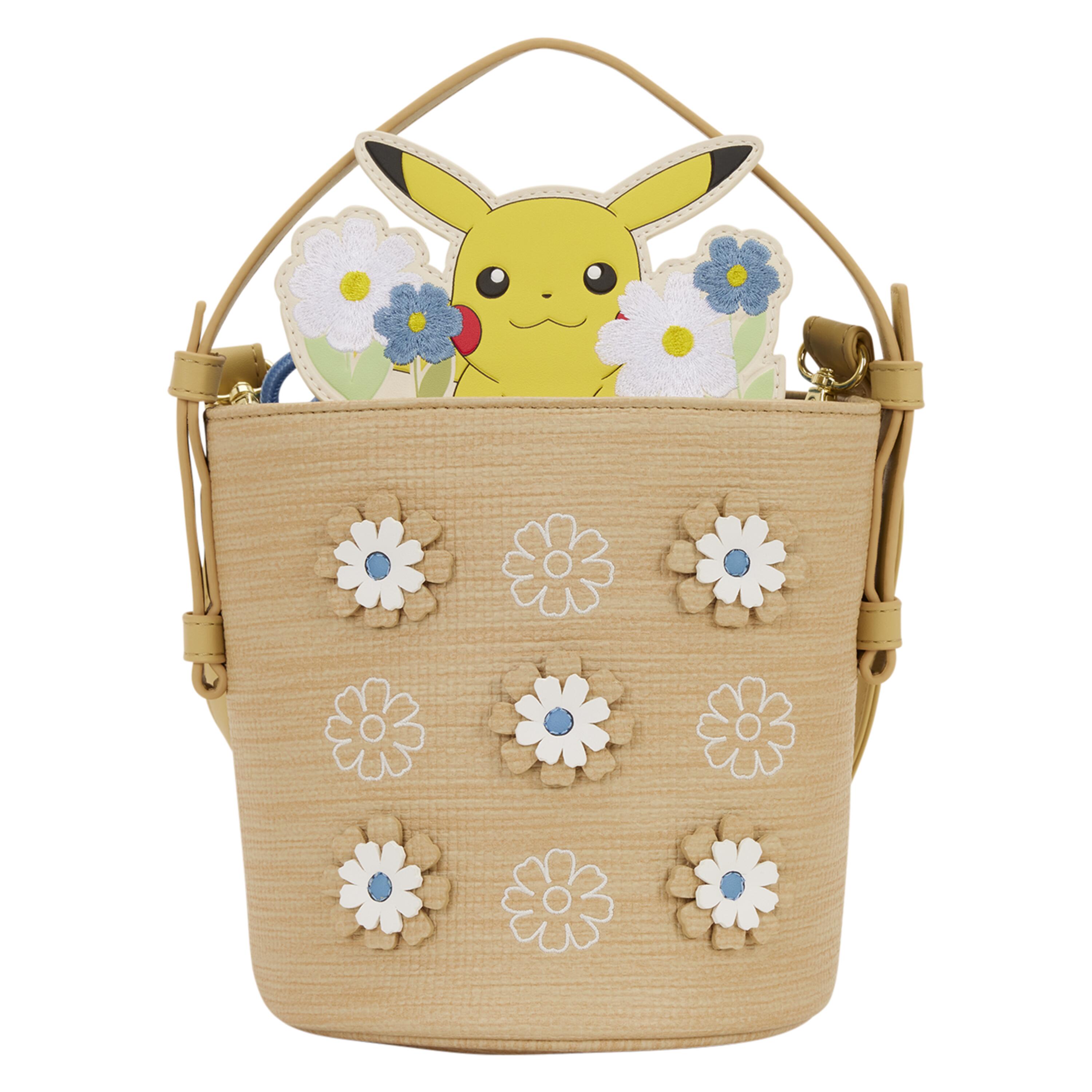 This bag looks like a woven basket—you'll find woven material and floral appliques all over. Sticking out from the basket are more flowers and Pikachu! This makes for such a cute accessory to hold your essentials throughout the day!