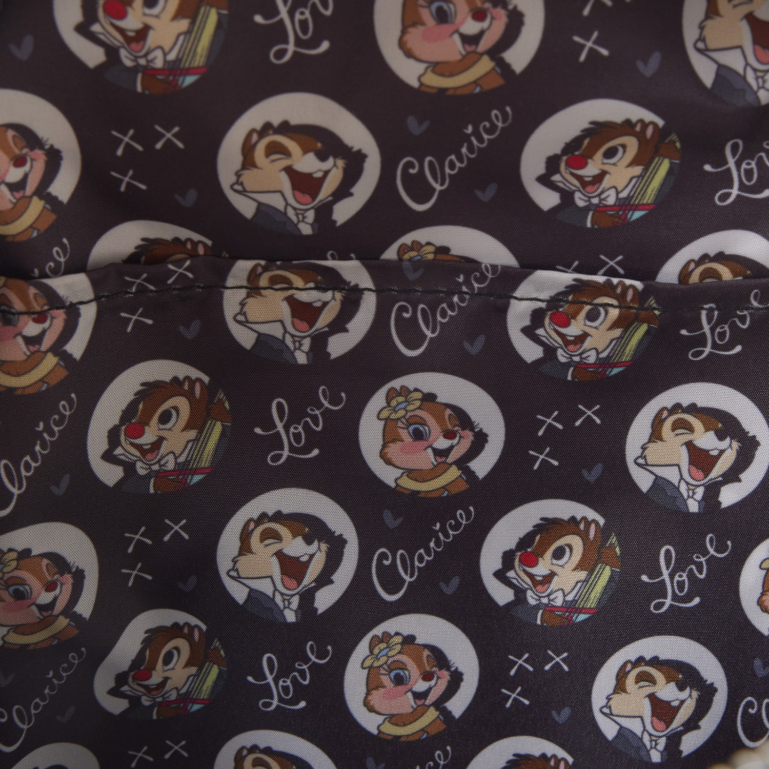 You'll find Chip 'n' Dale on the front of the bag, leaning one on top of the other. They feature embroidered facial details and plush material. The rest of the bag is inspired by their suits. On the side, you'll find an image of Clarice that's signed by her. For an extra cute detail, the zipper pull is a top hat!