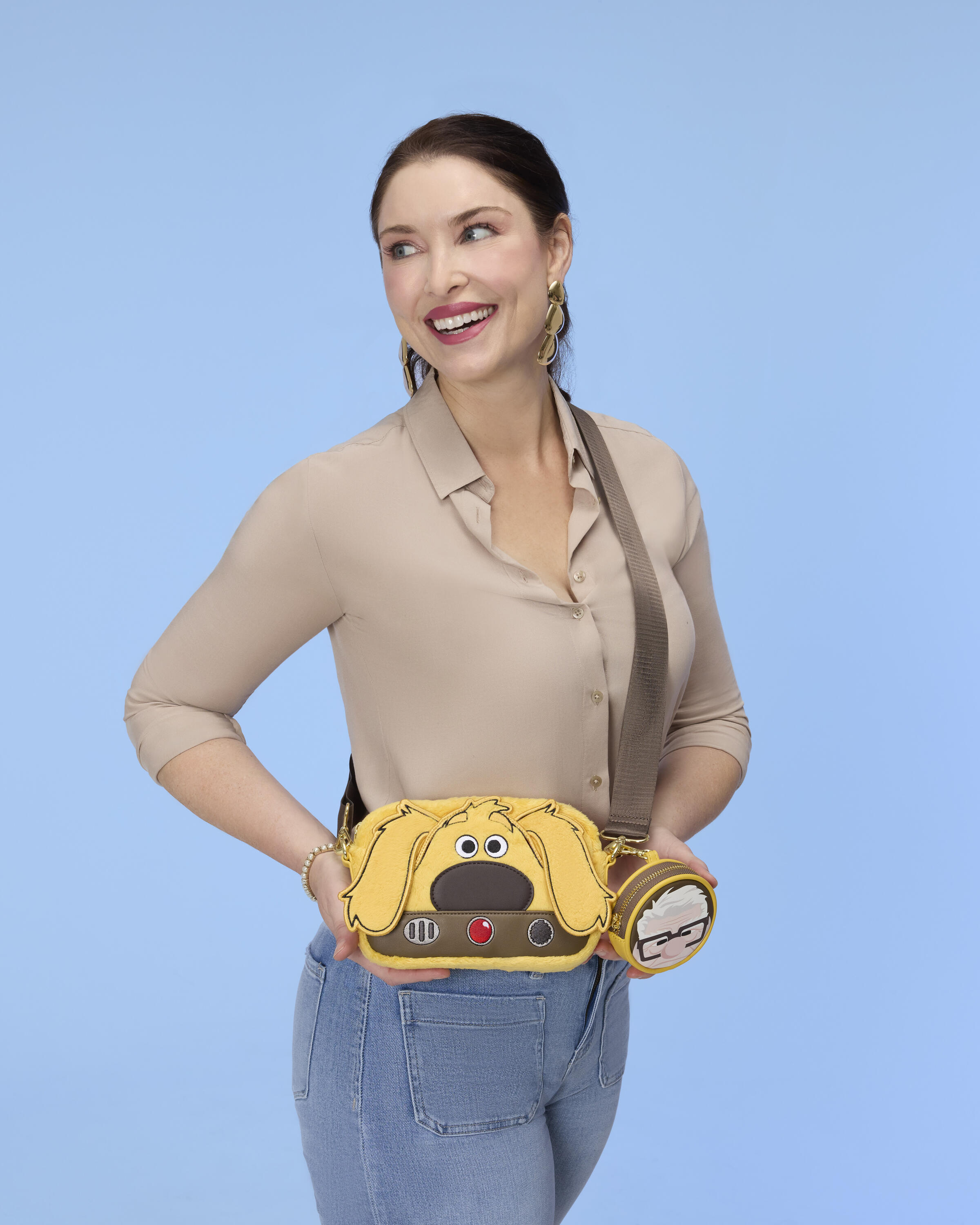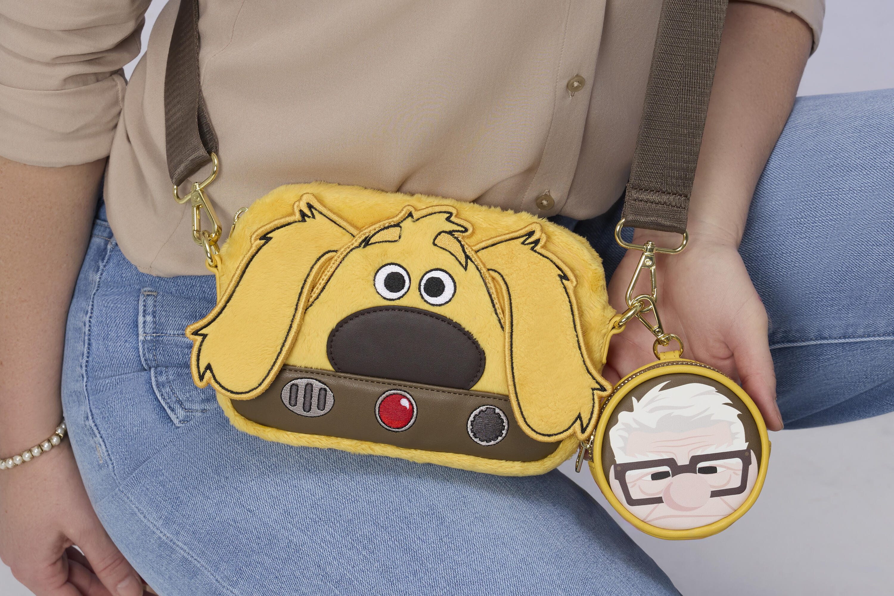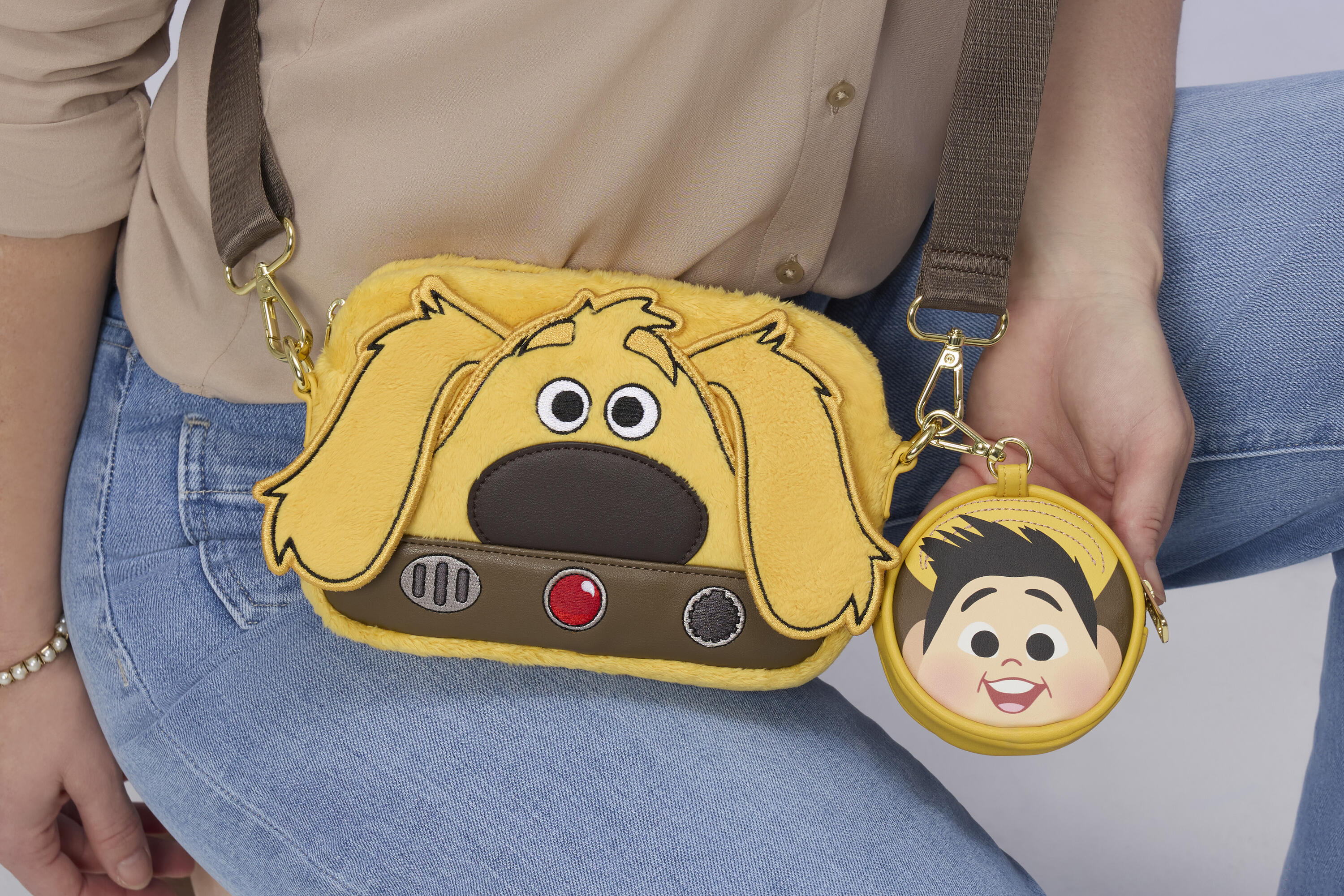 Dug comes to life on this sling bag in faux fur, applique, and embroidered detail. Turn the bag around to find his line, ""I Have Just Met You, and I Love You"" on the back. Plus, attached to the sling is a detachable coin bag featuring Russell on one side and Carl on the other!