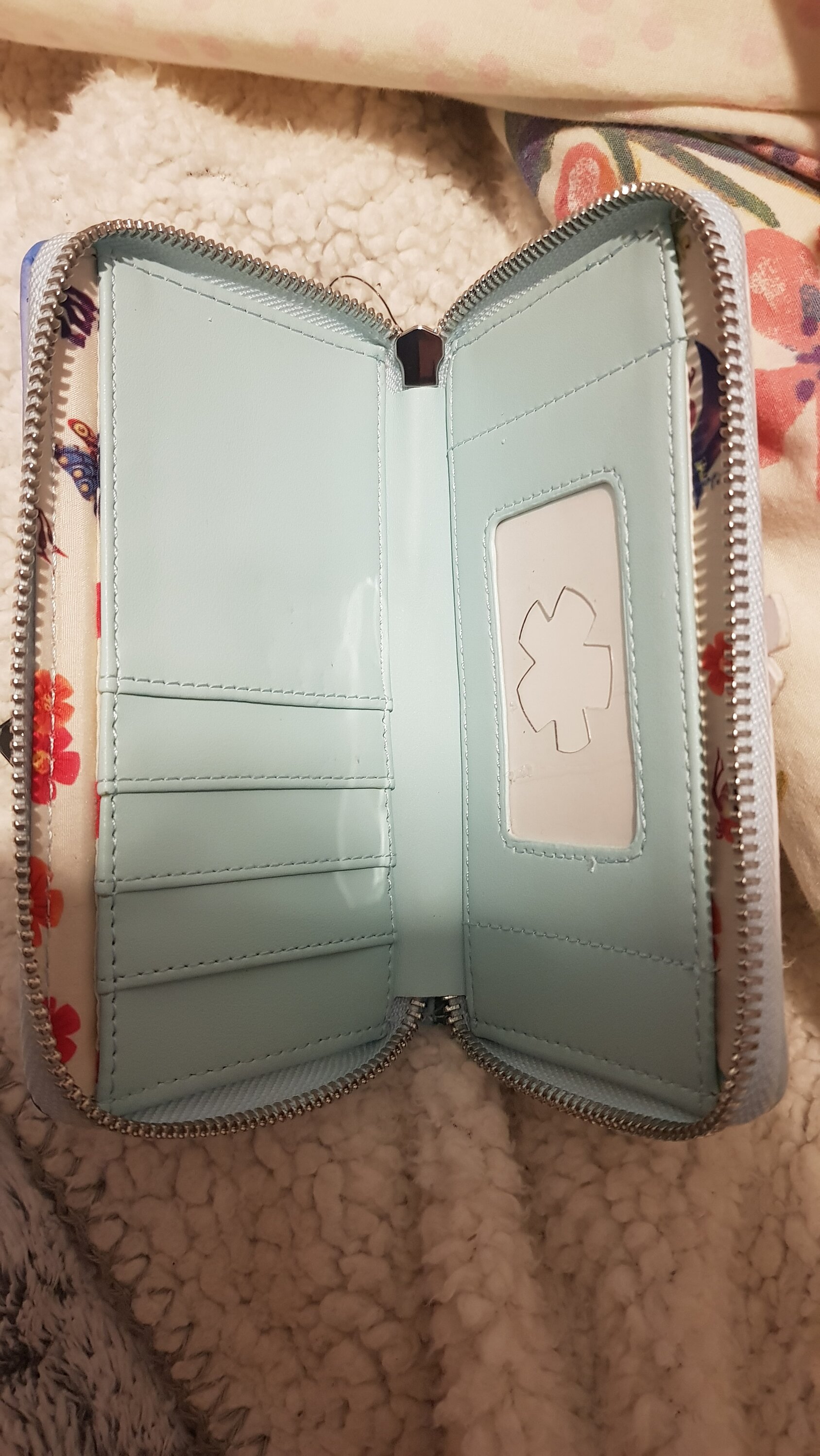 A really lovely wallet with its pastel colors and pretty design. The interior is well-organized for card storage. Absolutely fantastic!