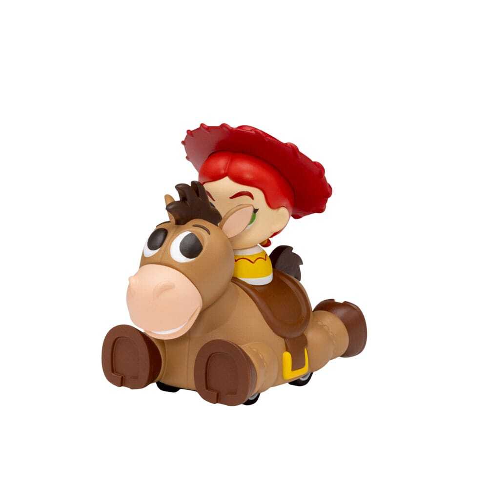 Pack of 6 friction-powered cars in mystery box packaging. Dimensions: 5 cm. Contents: - Woody - Forky - Lotso - Buzz Lightyear - Alien - Jessie & Heart - Secret: Pink Convertible Alien - Ratio: 1.72