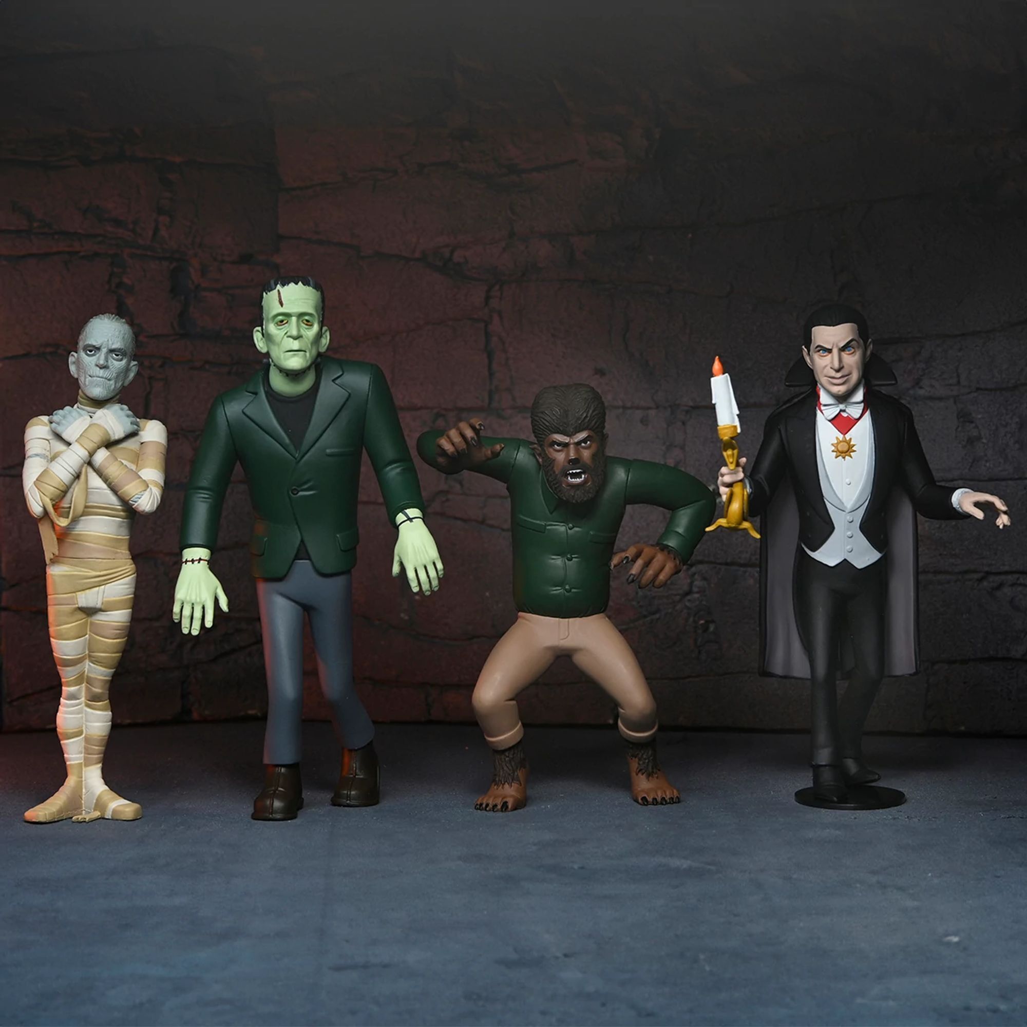 Dive into our horror collection with these adorable little monsters! Fans of the famous monsters will love this series of figurines, which includes the Wolf Man, the Mummy, Dracula, and Frankenstein's Monster! Each figurine, measuring approximately 15 cm tall, comes in new packaging with a bonus die-cut background. Height: 15 cm