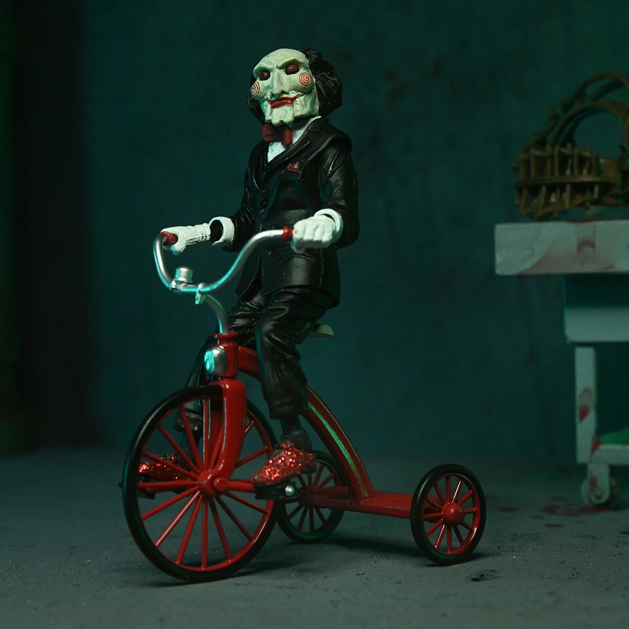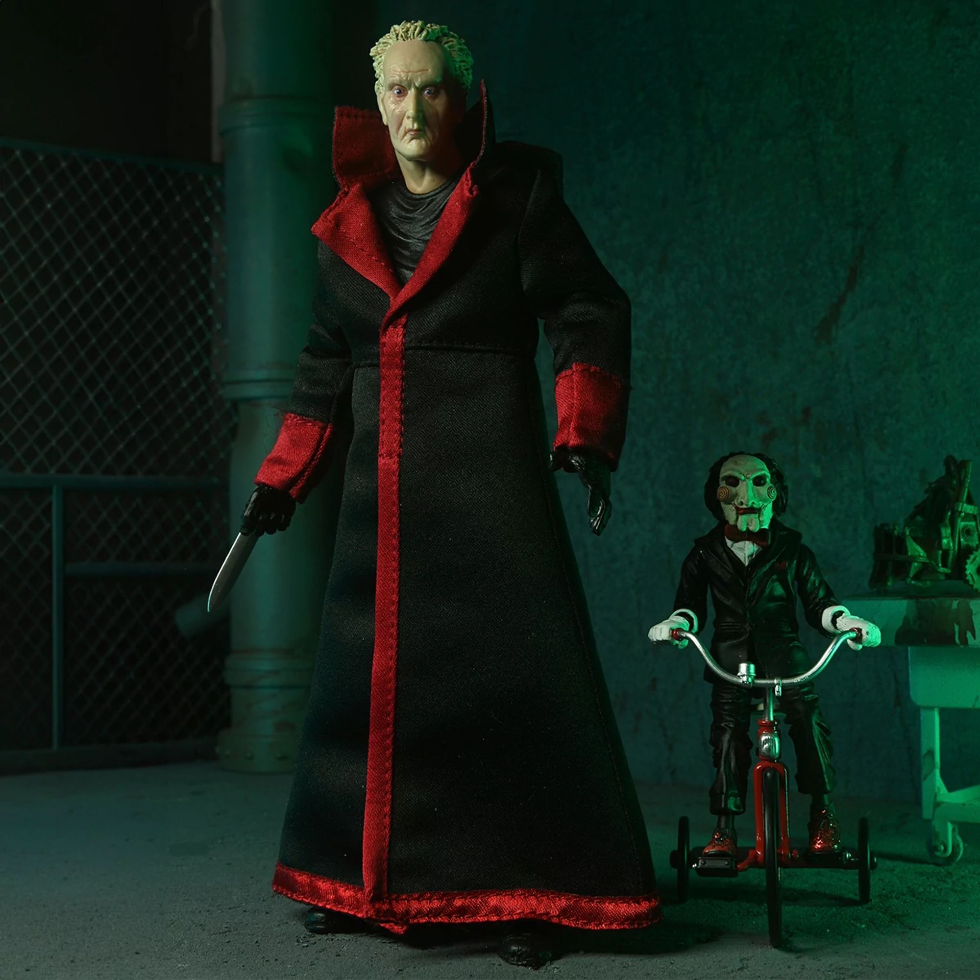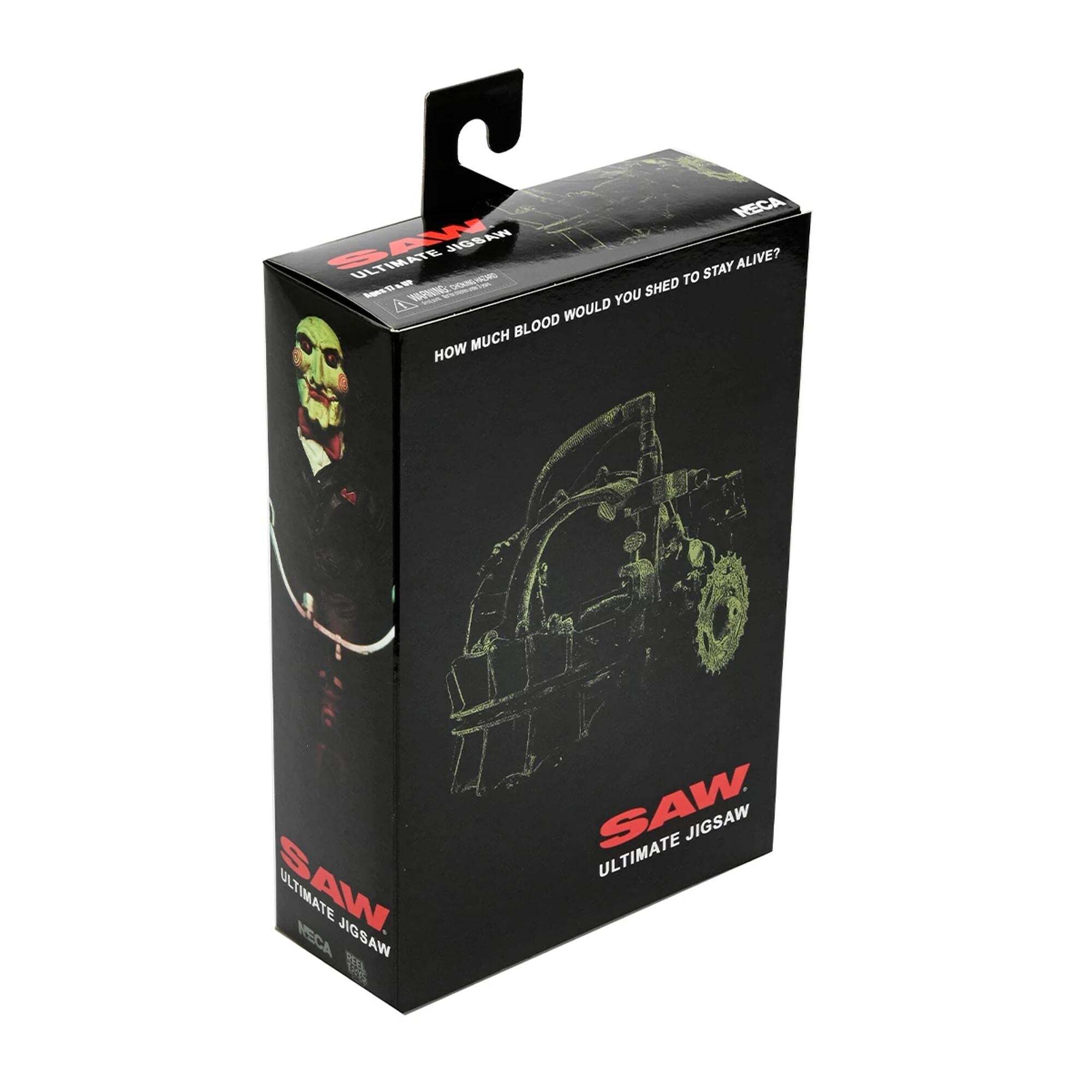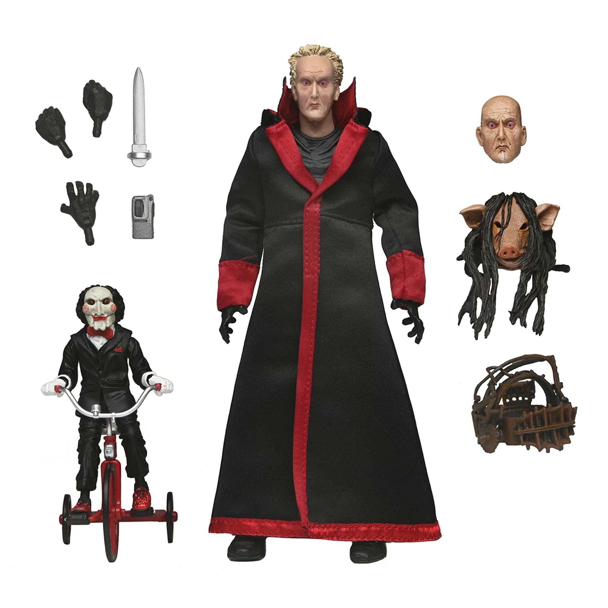 Dive into the twisted world of Saw with this Ultimate Jigsaw figure! The legendary killer, who forces his victims to confront their life choices through terrifying trials, comes alive here with a fully articulated black robe and a wired body. It comes with must-have accessories: interchangeable heads and hands, a pig masked head, a puzzle head trap, a recorder, an extendable blade, and Billy the puppet on his tricycle. This figure comes in a window box packaging with a flap, perfect for collectors. Height: 17.5 cm