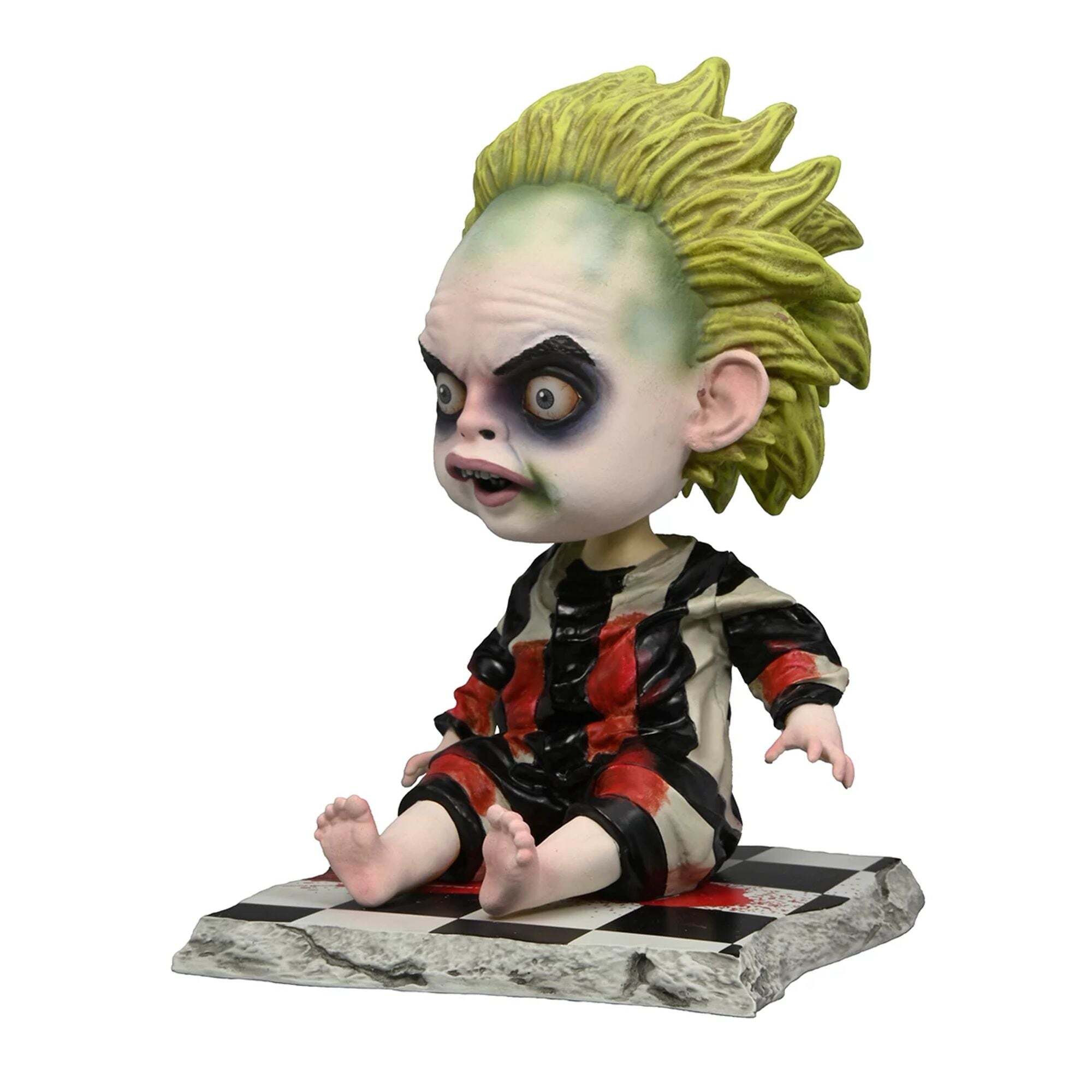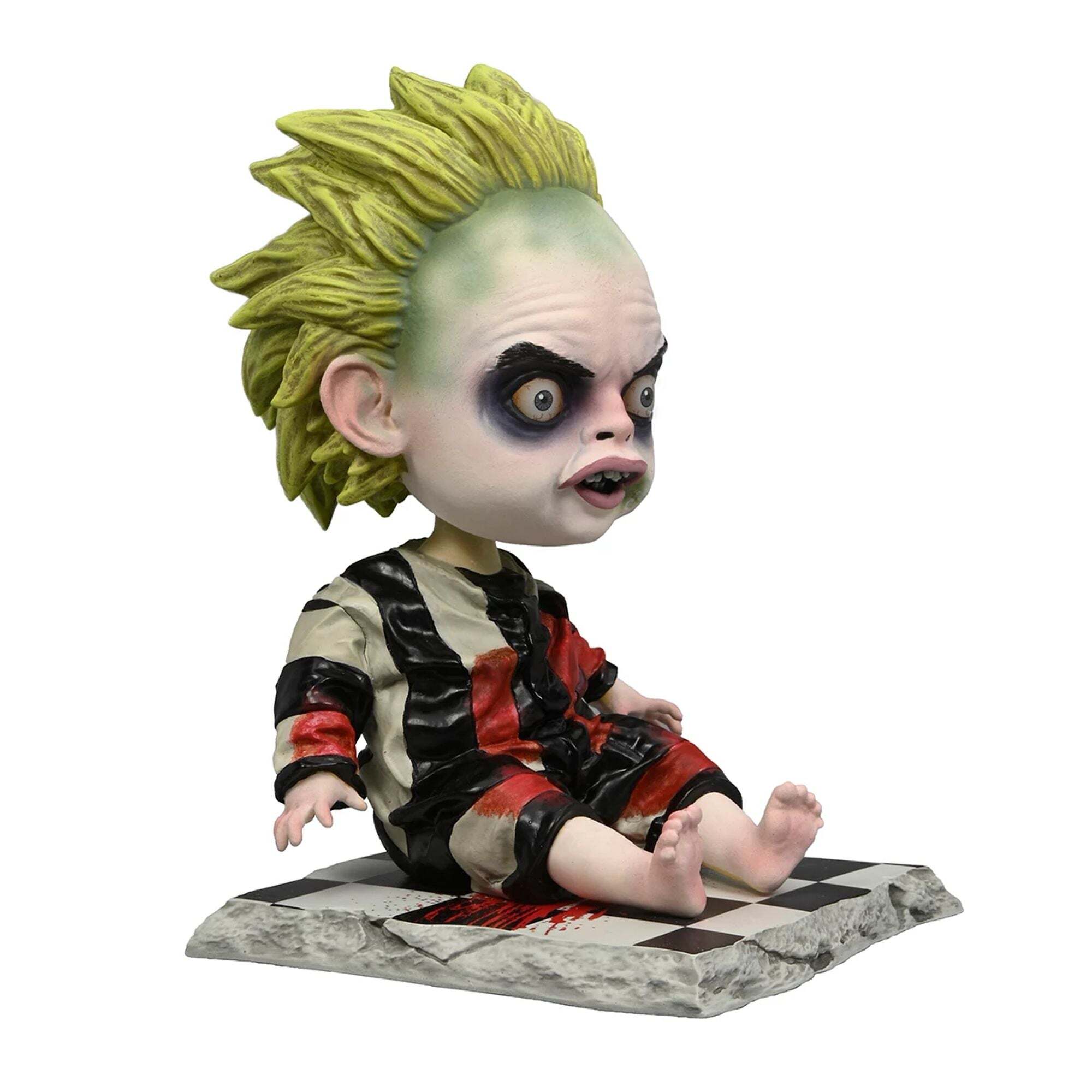 Straight from the imagination of Tim Burton, Baby Beetlejuice has arrived! The iconic character from the 2024 film Beetlejuice is now available in a Head Knocker version. This terrifying Baby Beetlejuice figure is seated and equipped with a spring-loaded mechanism that makes its head move for an interactive effect. Standing over 6.5 inches tall, Baby Beetlejuice is made of resin and hand painted for an even more sinister effect. Add him to your horror collection and show everyone how much you love Beetlejuice... Beetlejuice... Height: 16cm