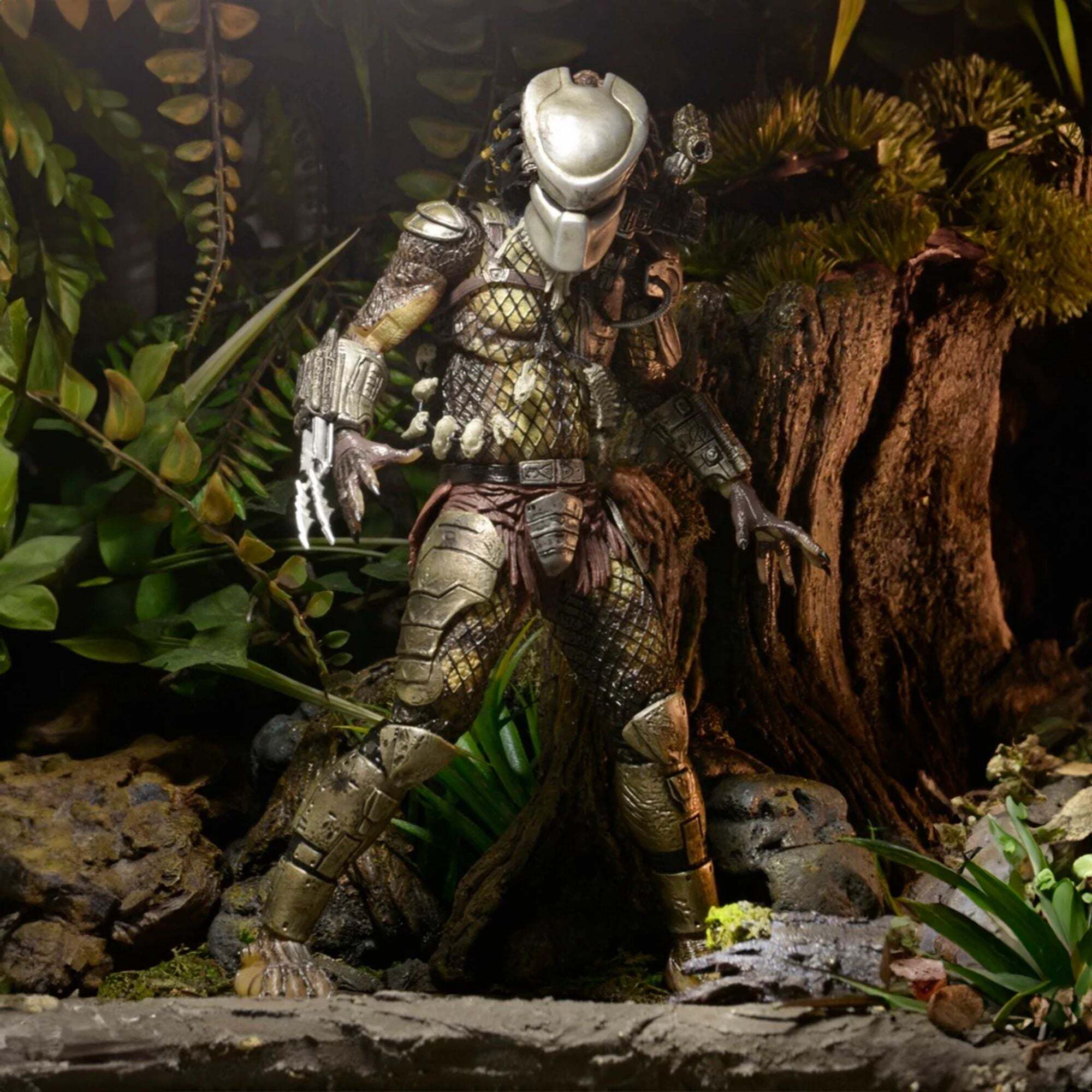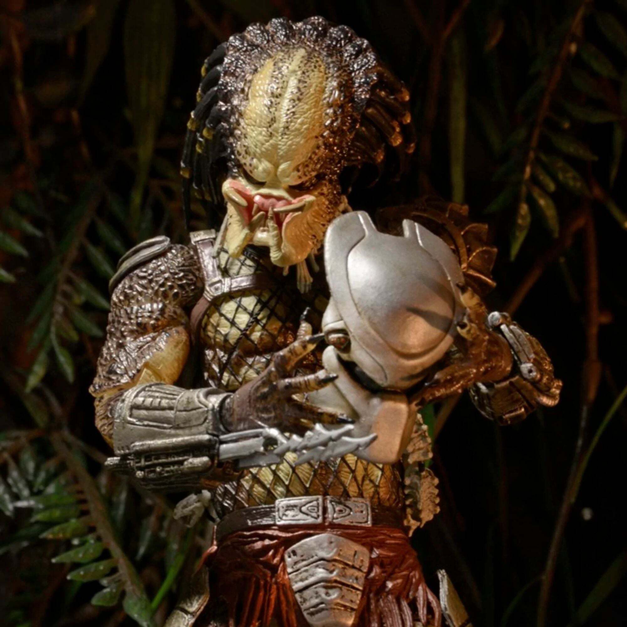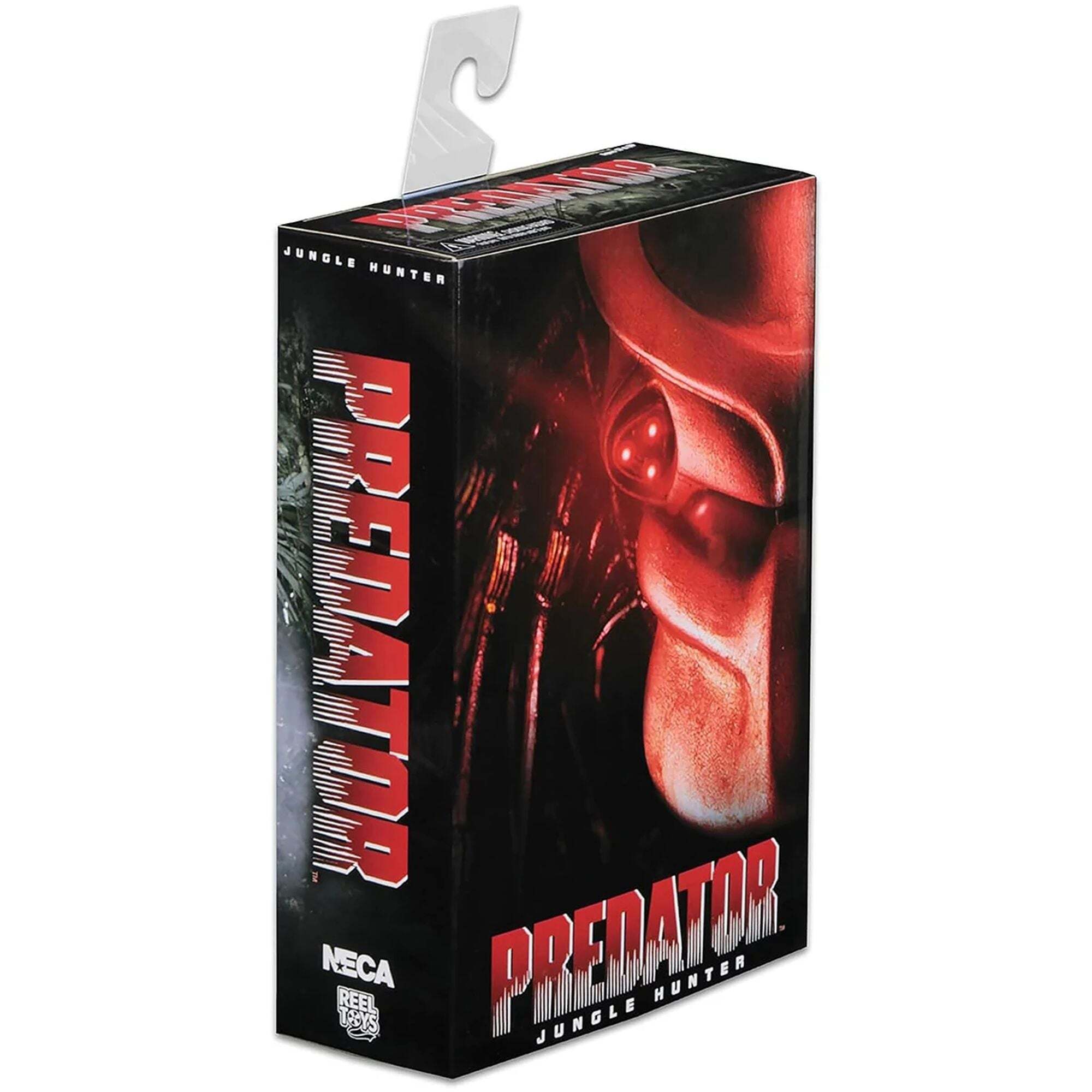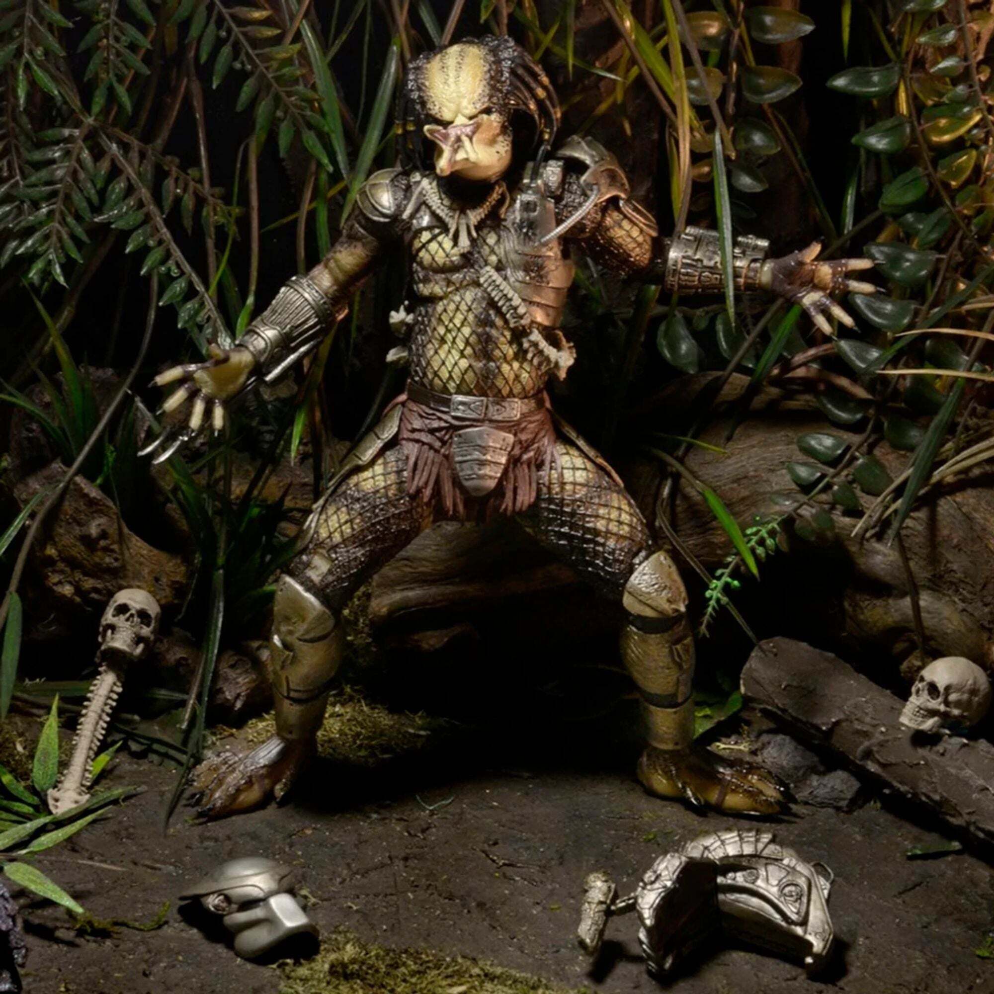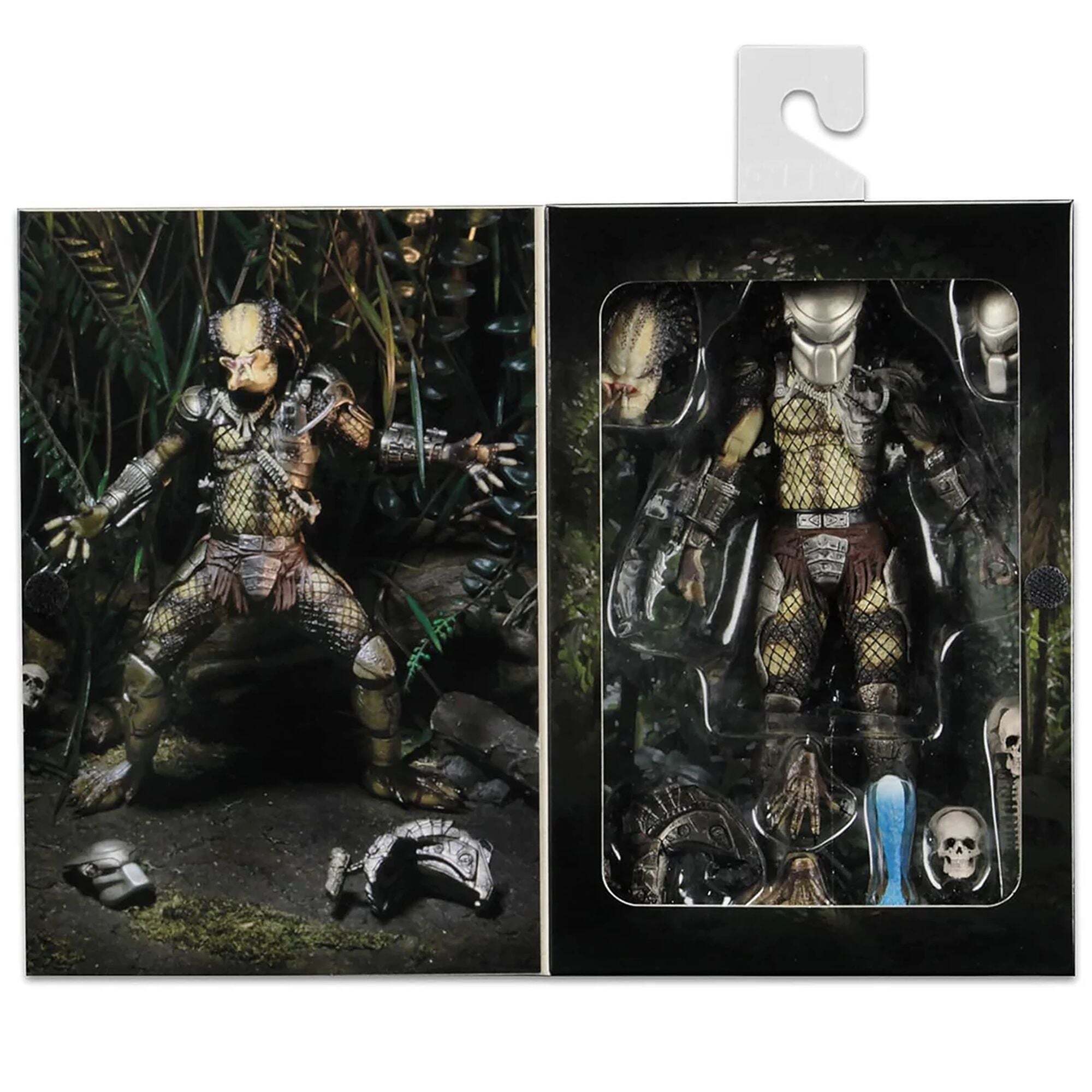 "Finally, the classic Predators are back, with major upgrades! Inspired by the original Predator movie, we present the definitive collector's edition of the Jungle Hunter. This Hunter has received the "Ultimate" treatment, including additional articulation in the biceps (bicep swivel), elbows (double elbow joints), and torso, as well as an opening wristband! He comes with interchangeable heads and hands, as well as a spine, mask, cannon blast effect, and human skull. Presented in a display case, ideal for collectors." Height: 18cm