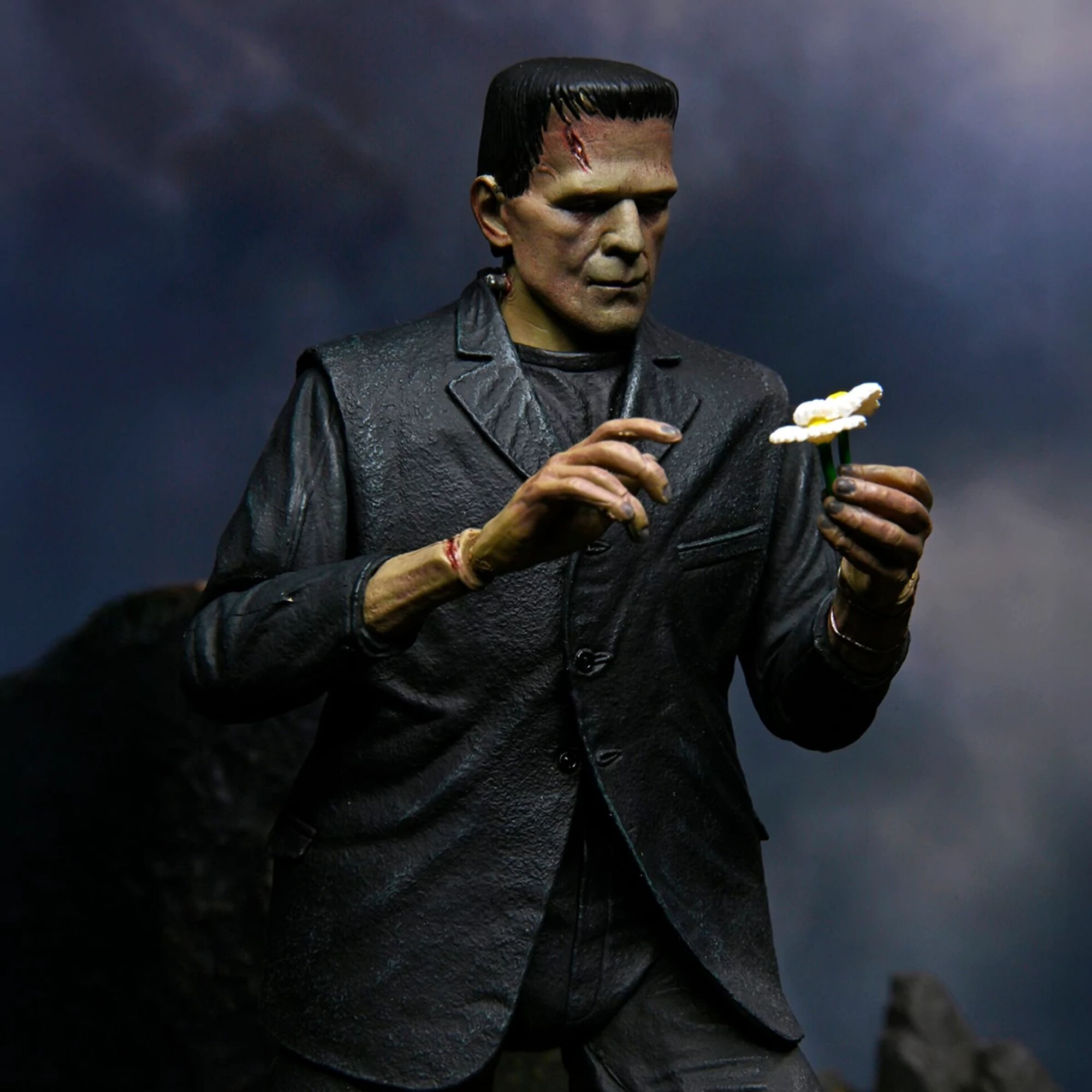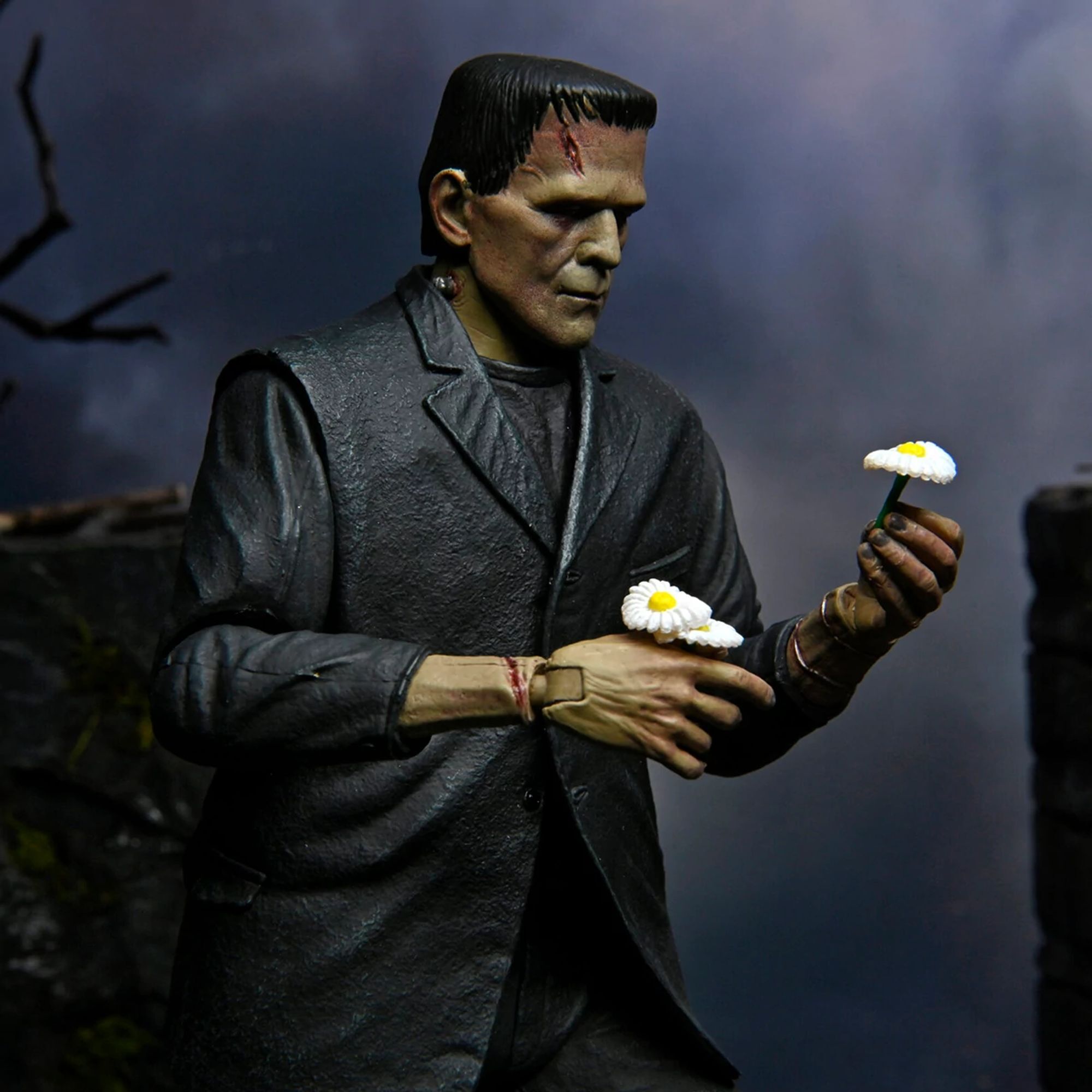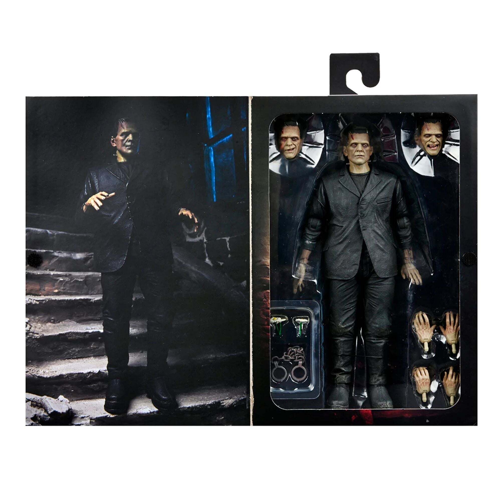 "To celebrate the 90th anniversary of the classic film Frankenstein, NECA is proudly introducing the Universal Monsters to its Ultimate action figure line! The sculpture pays homage to Boris Karloff's moving interpretation of the misunderstood monster, presented here in a colorized version. The 7-inch figure comes with numerous accessories: 3 interchangeable heads, 6 interchangeable hands, chains, and a bouquet of daisies. All presented in special anniversary collector's packaging." Height: 7 inches