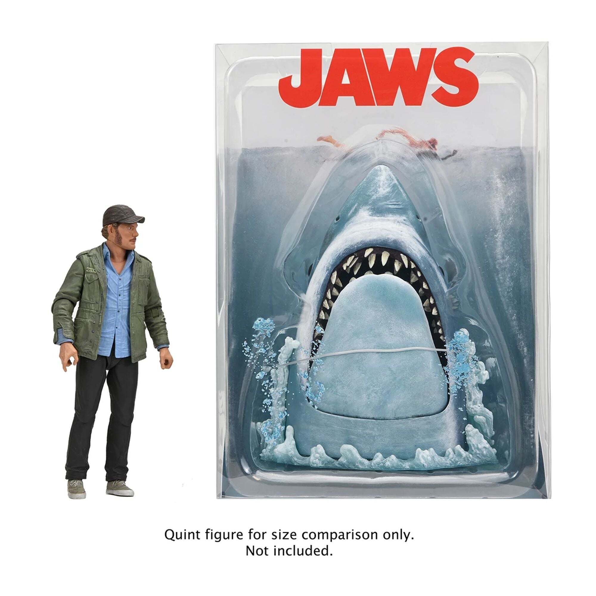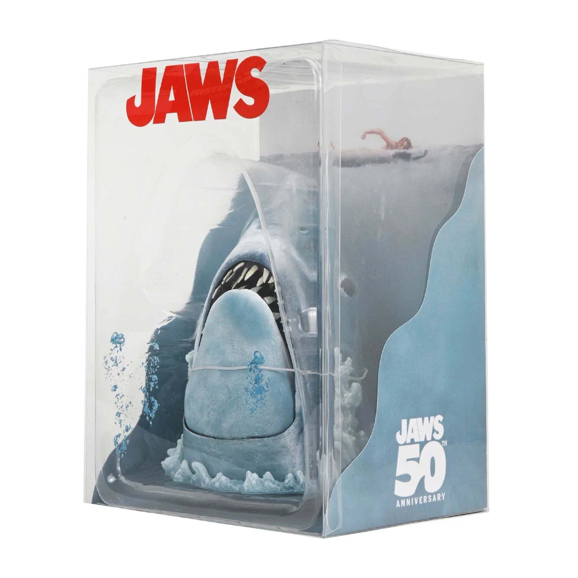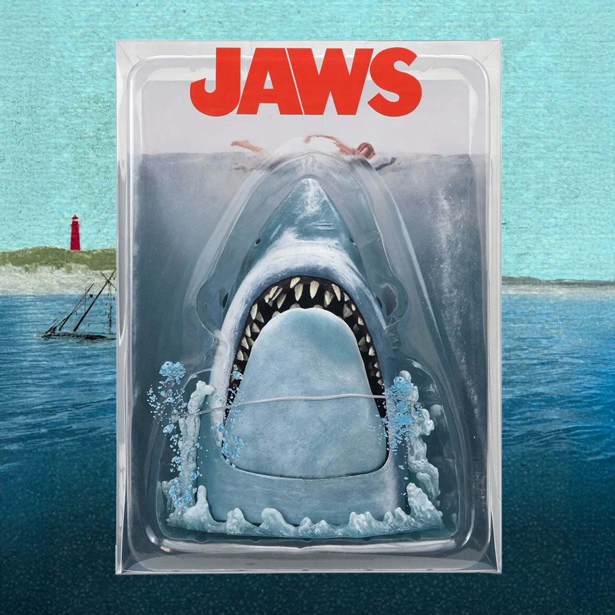 To celebrate the 50th anniversary of the cinematic masterpiece Jaws, NECA is releasing a stunning collectible: a 3D recreation of the iconic film poster. This figure faithfully captures Roger Kastel's terrifying mako shark, featuring intricate sculpting and a poseable jaw. Mounted on an aquatic base with sculpted wave and bubble effects, the shark appears to rise from the depths to attack. The set comes packaged in clear packaging with a background insert inspired by the original poster. A unique creation at the intersection of art and cinema.