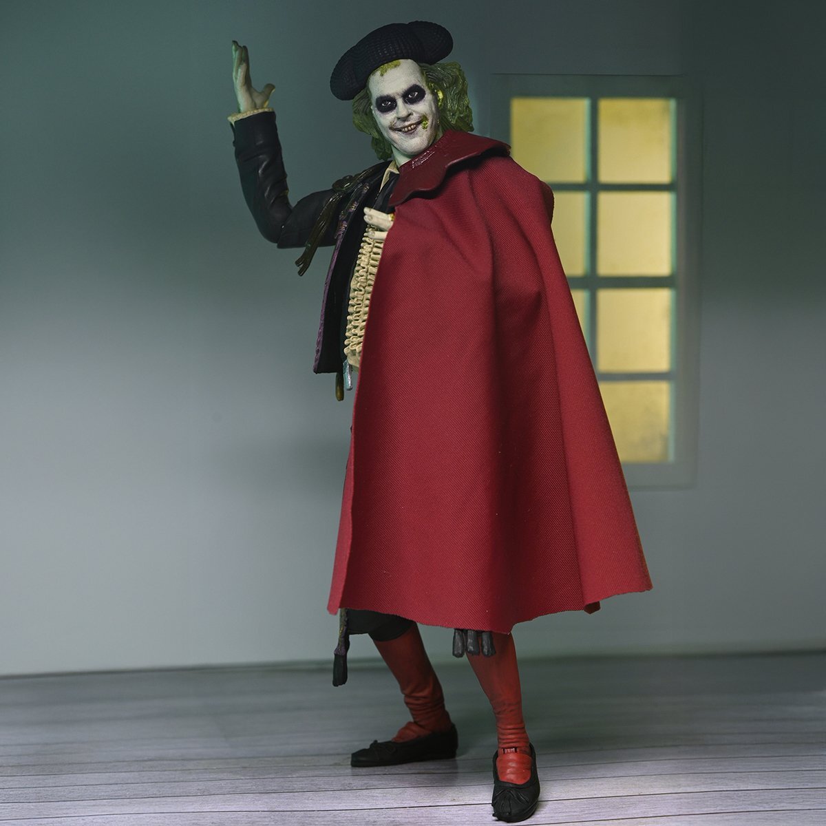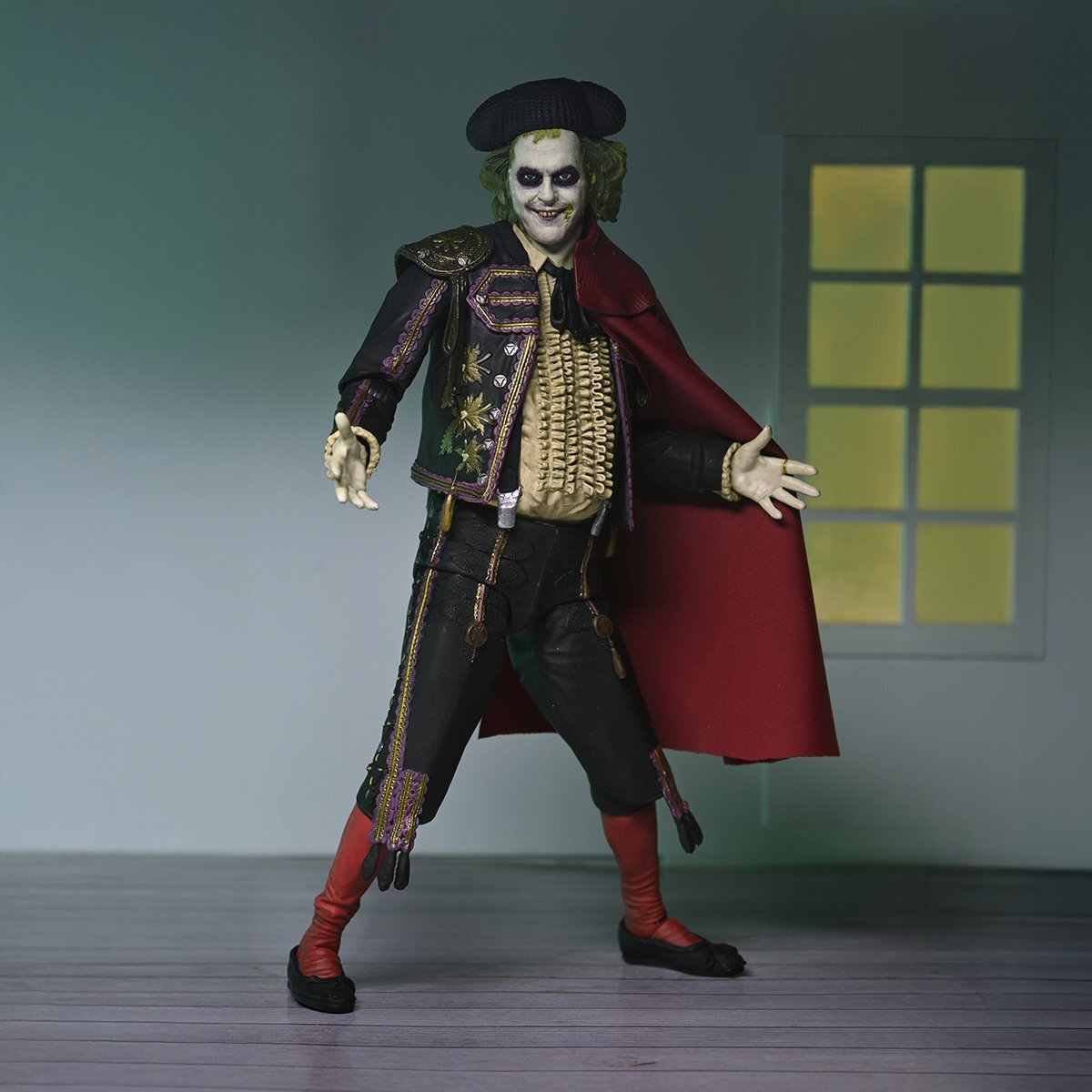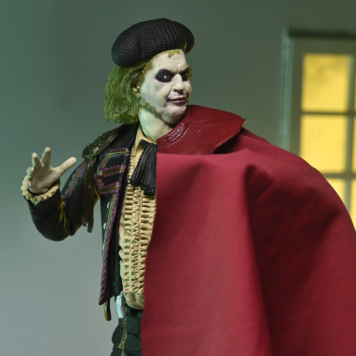 The most famous ghost is back! From Tim Burton's 2024 film sequel, Beetlejuice, the infamous bio-exorcist returns once again to manipulate Lydia into marrying him and finally escaping the afterlife. During the wedding, his nefarious plan is thwarted when Lydia's daughter, Astrid, summons a sandworm into the world of the living to stop him. Beetlejuice quickly transforms into a matador to distract the monstrous sandworm so that it swallows his ex-wife instead. NECA brings the chaos of this iconic scene to life! Height: 18cm