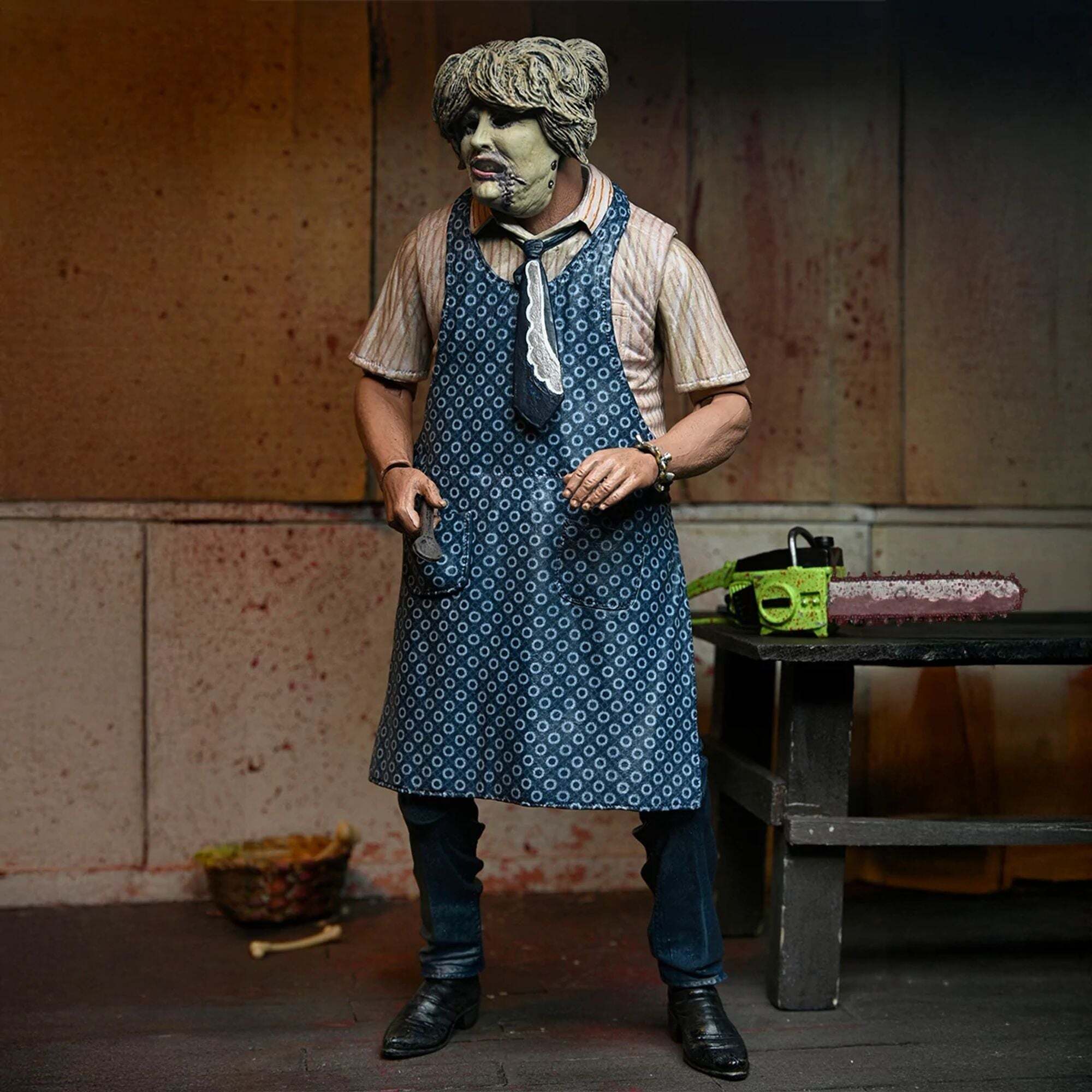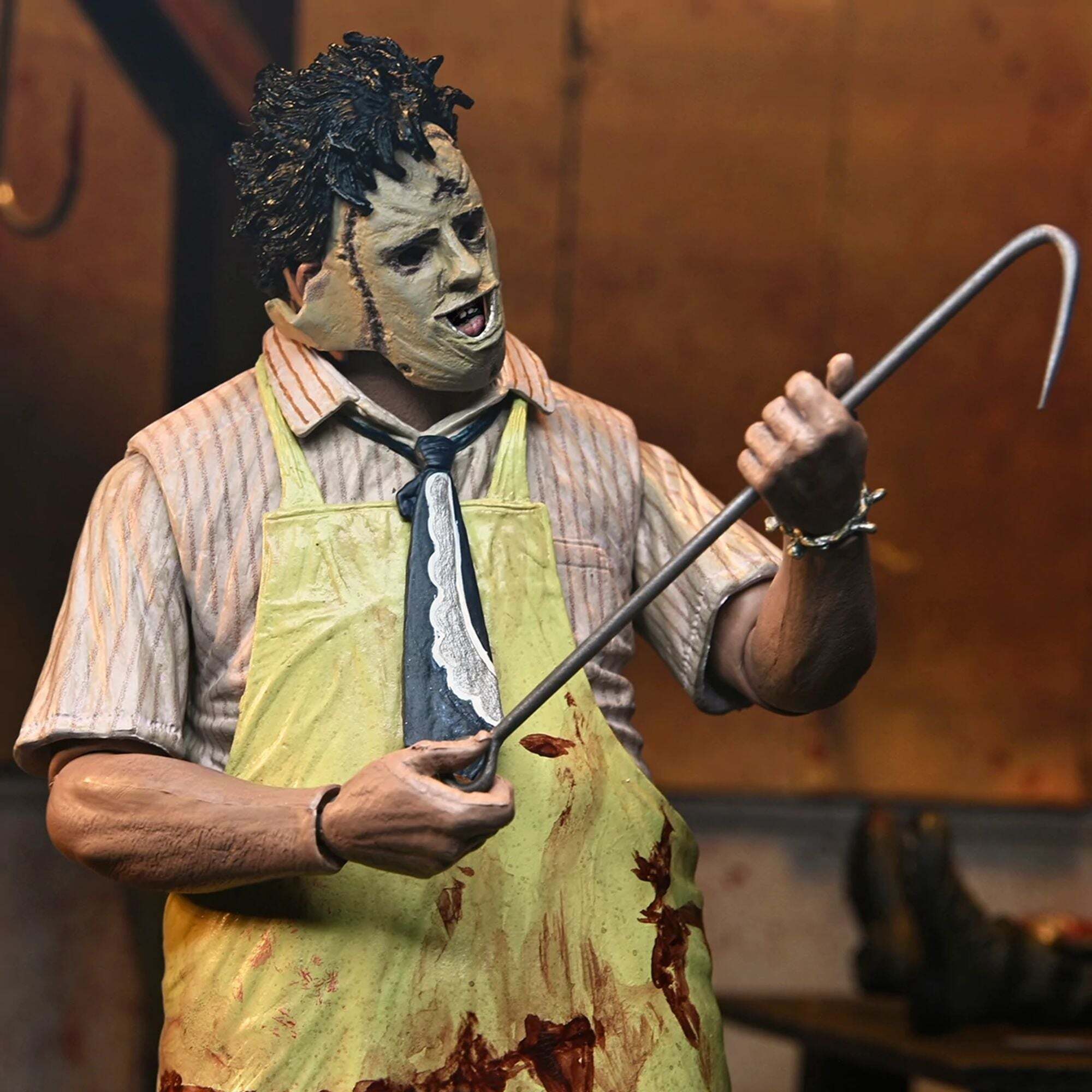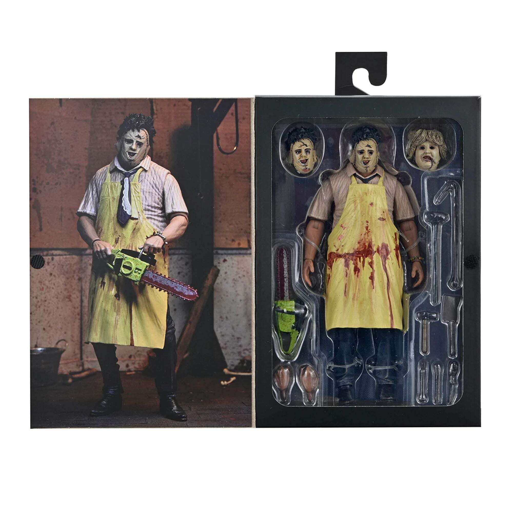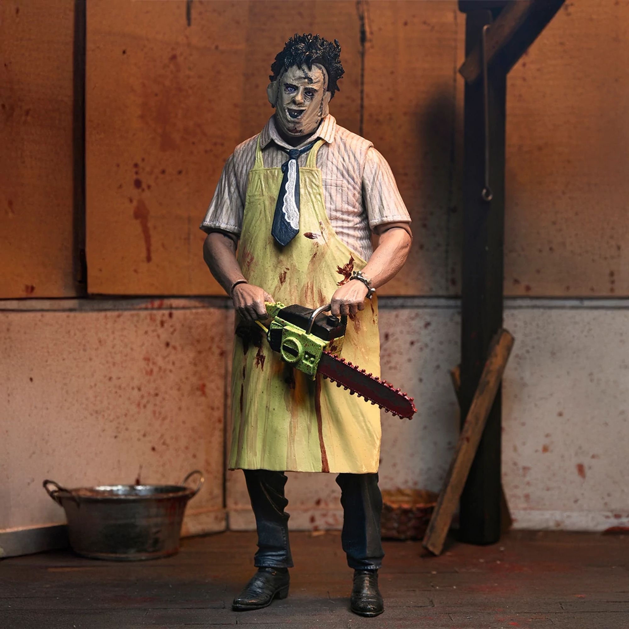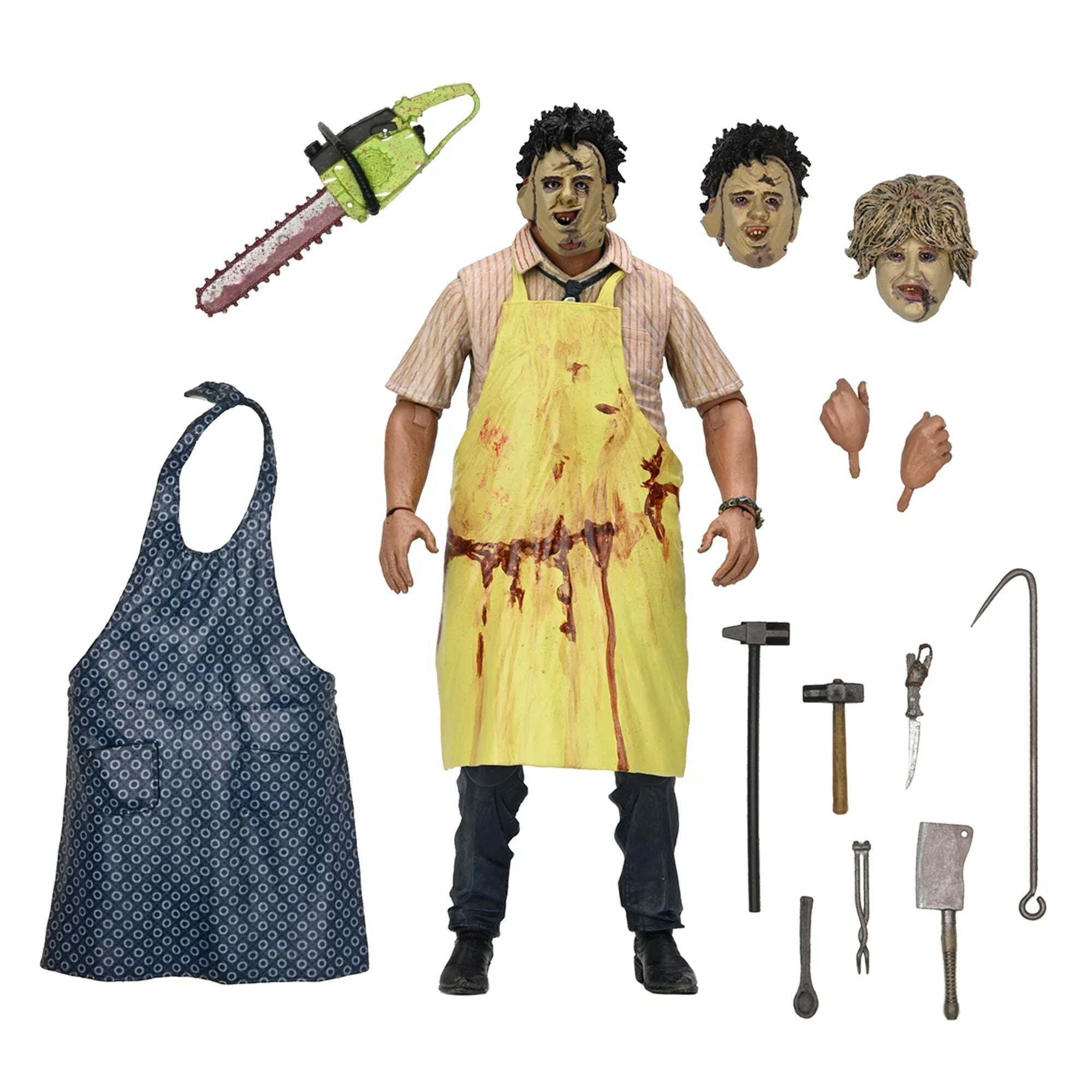 "To celebrate the 50th anniversary of The Texas Chainsaw Massacre, NECA is bringing Leatherface back with a brand-new, completely redesigned Ultimate version! Tobe Hooper's 1974 cult classic revolutionized horror cinema, and this is the perfect opportunity to add a piece of it to your collection. This highly articulated 18cm figure features two styles thanks to its interchangeable aprons, as well as three heads and several alternate hands. As for accessories, it comes equipped with the iconic arsenal of the Texas butcher: a bloody chainsaw, hammers, pliers, knife, cleaver, butcher's hook, spoon, and even a bracelet. All of this is presented in a collector's box with a front opening. A must-have for Leatherface fans… Add it to your collection now!"