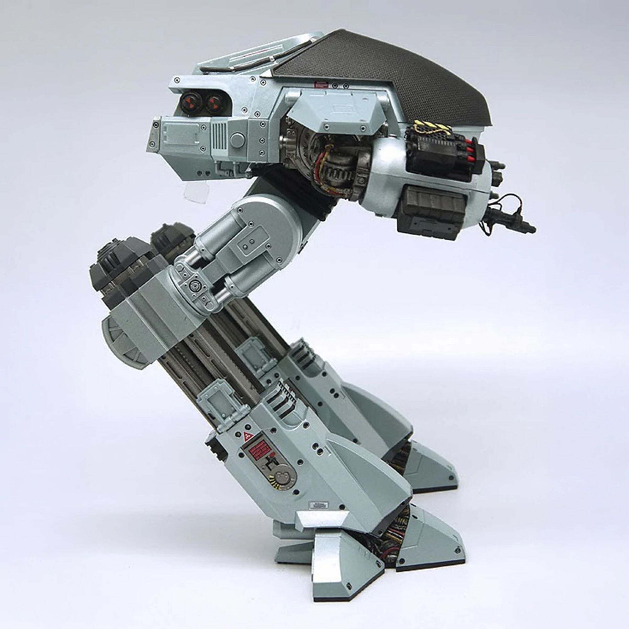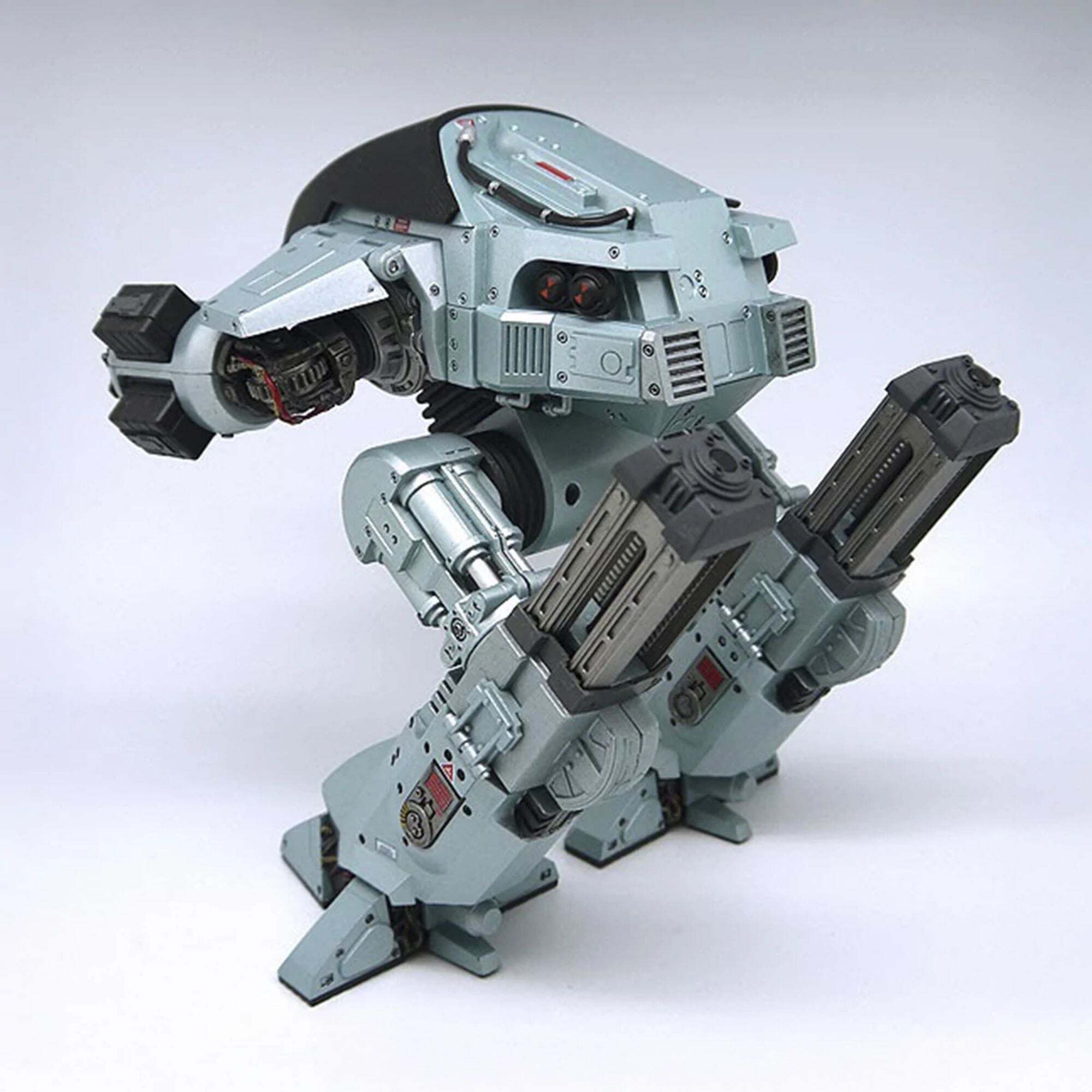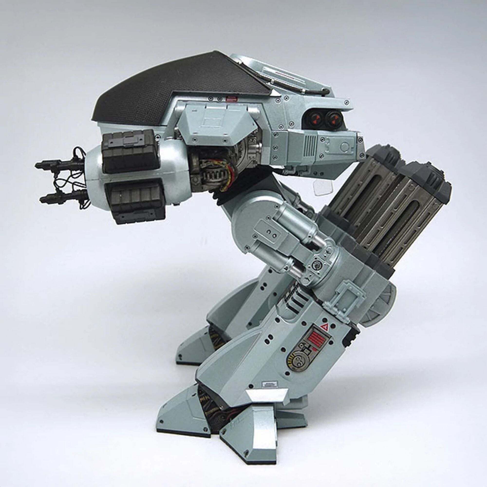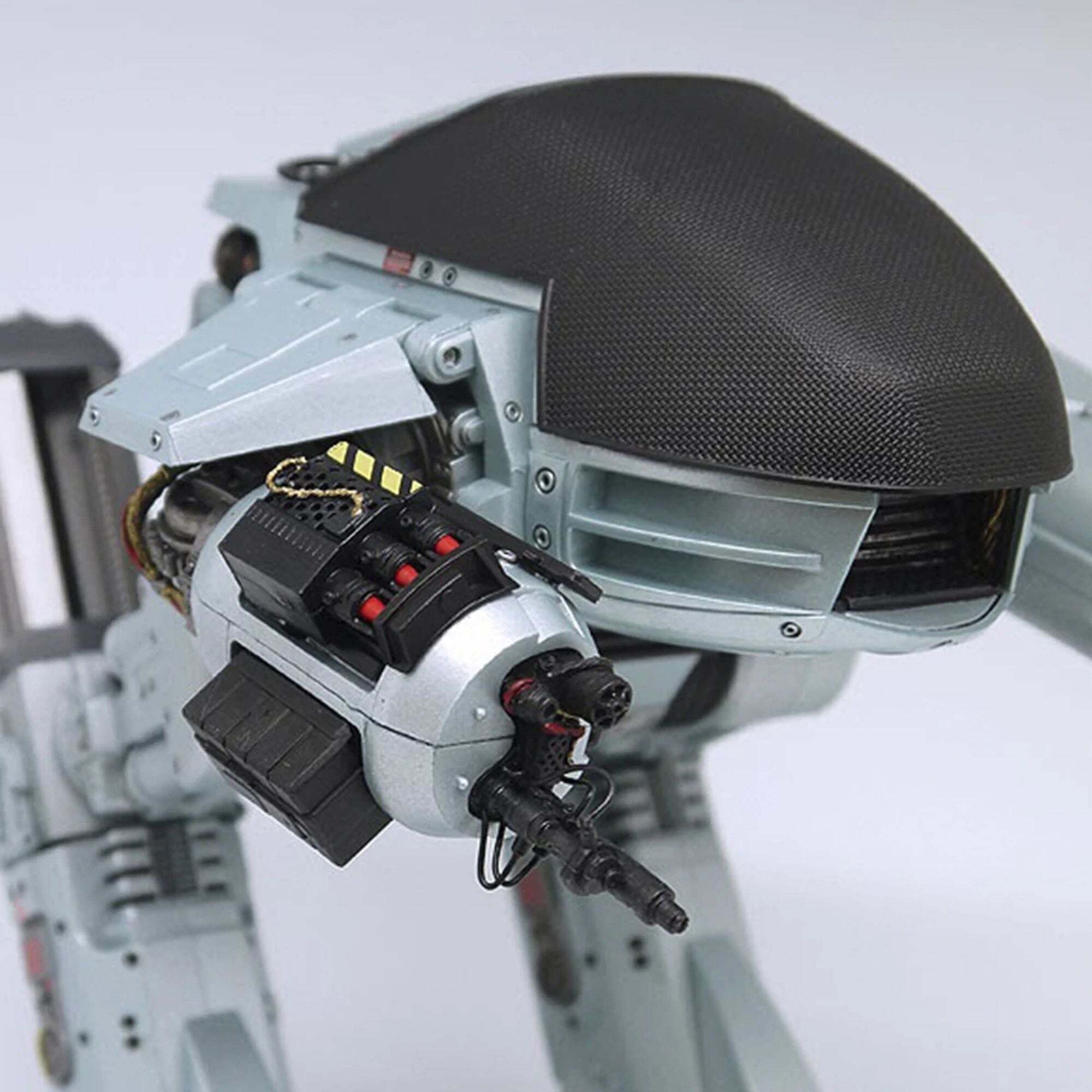 The future of law enforcement has arrived! Straight from the original RoboCop movie, the impressive ED-209 (Enforcement Droid Series 209) stands nearly 25 cm tall and is perfectly scaled to match the 18 cm RoboCop figures (sold separately). A true mechanical behemoth, it finally provides a worthy adversary for the famous cyborg police officer. Fully articulated and boasting exceptional detail, this ED-209 features a rotating head, sliding legs, articulated arm panels, and movable cannons. It also incorporates sound effects and lines from the movie: hydraulic sounds, mechanical noises, and the famous phrase, "Warning: throw down your weapon. You have 15 seconds to comply."