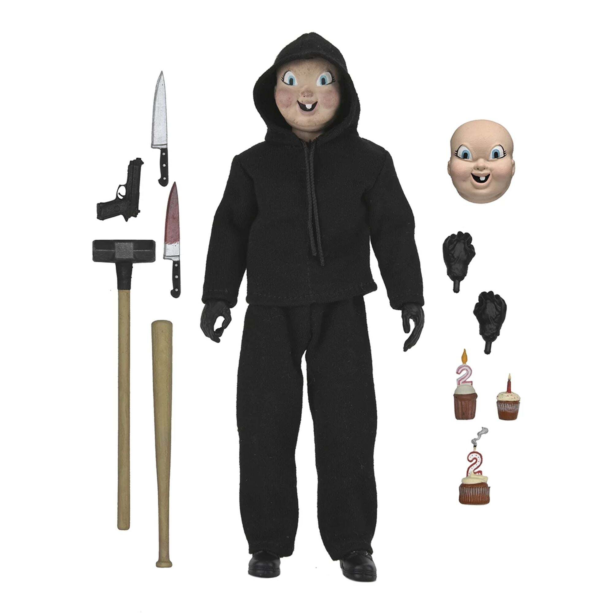 The masked killer from Happy Death Day returns as an 20 cm retro-style action figure from NECA. This clothed Babyface Killer captures the essence of the Blumhouse slasher with its interchangeable mask and arsenal of terrifying weapons. Inspired by vintage lines, this figure wears custom-tailored fabric clothing and offers full articulation. Swap masks, heads, and hands to create a variety of gruesome poses. The collector's window box packaging perfectly protects this modern horror piece.