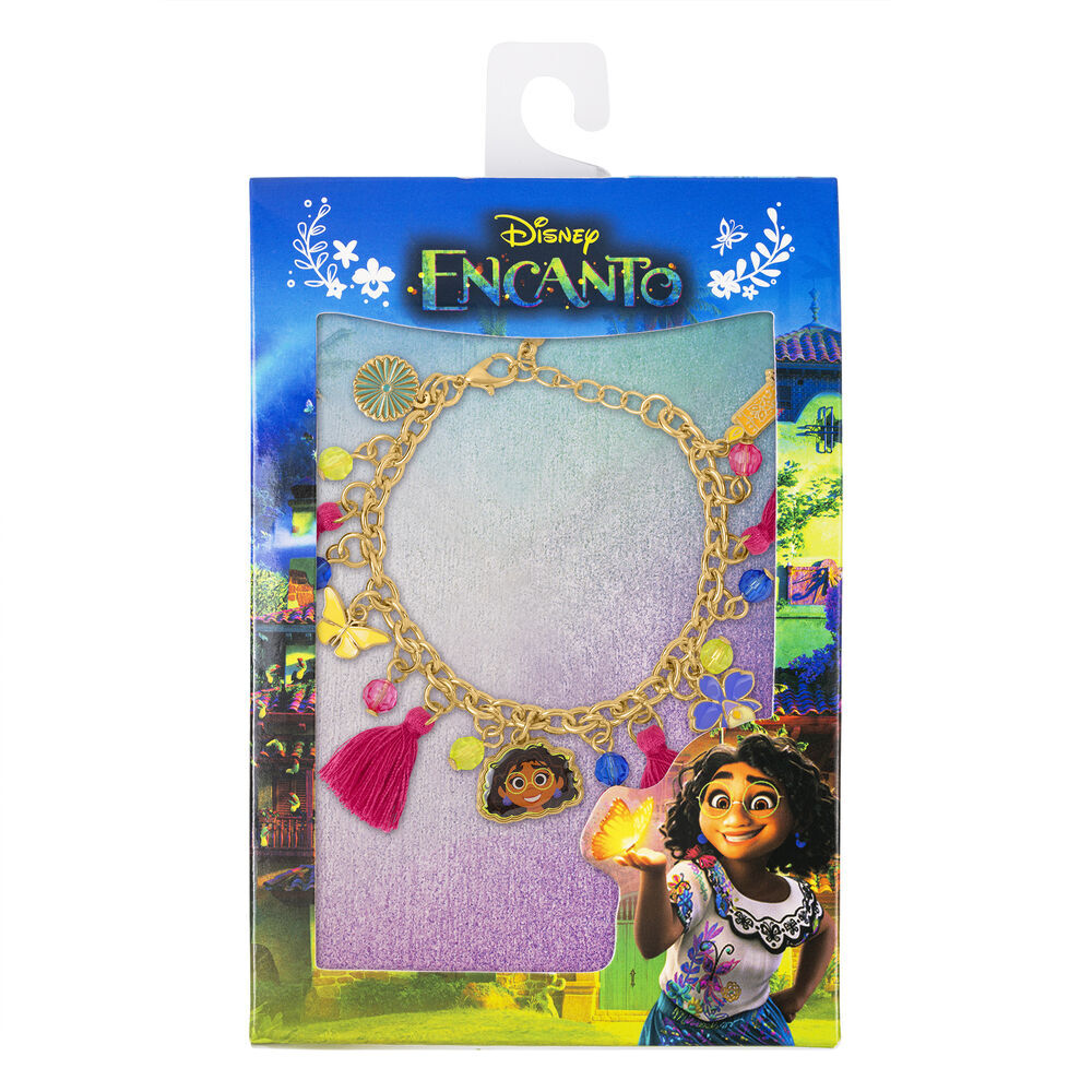This gold chain bracelet has pink tassels, butterflies and flowers and a pendant of Mirabel herself. Delivered in official Disney packaging.