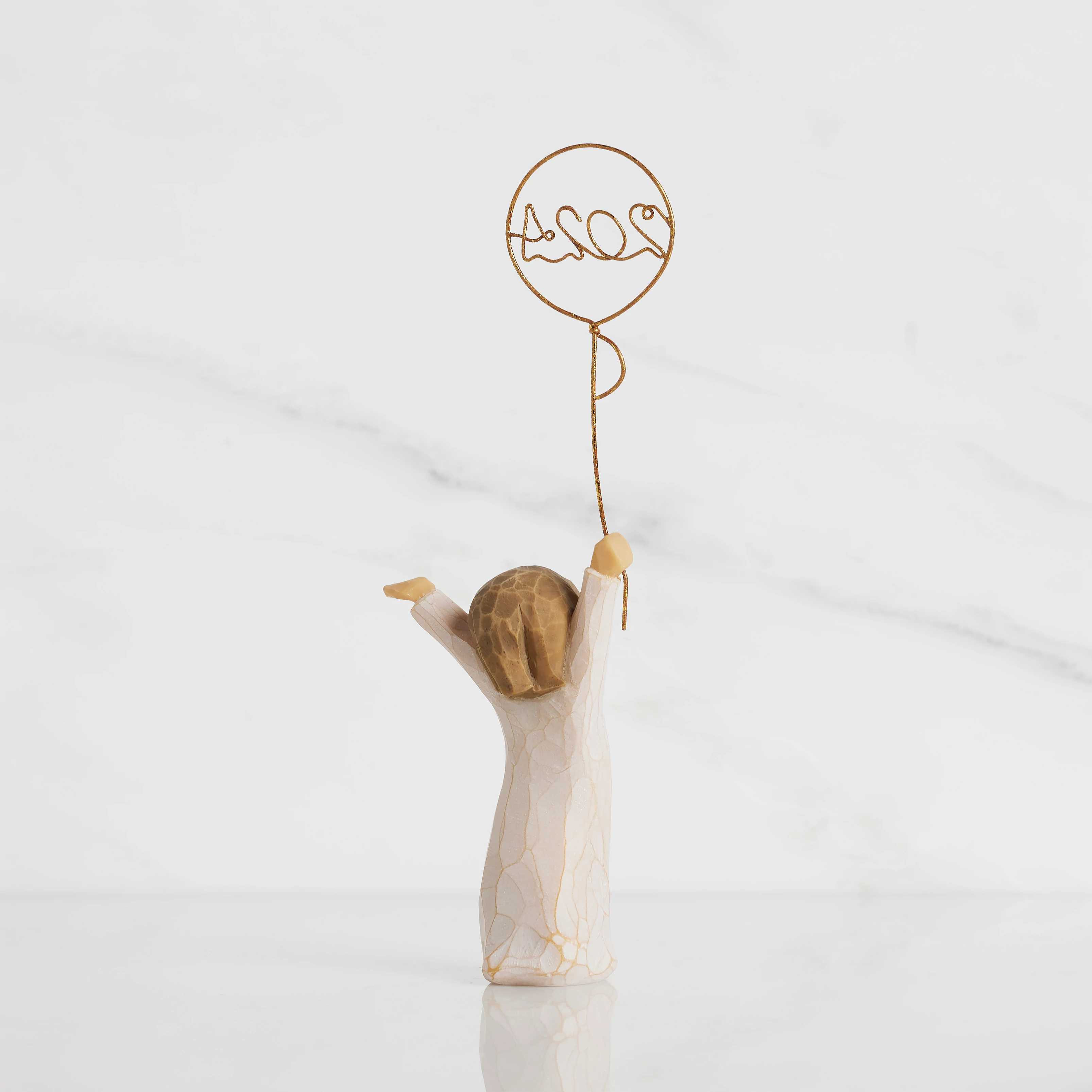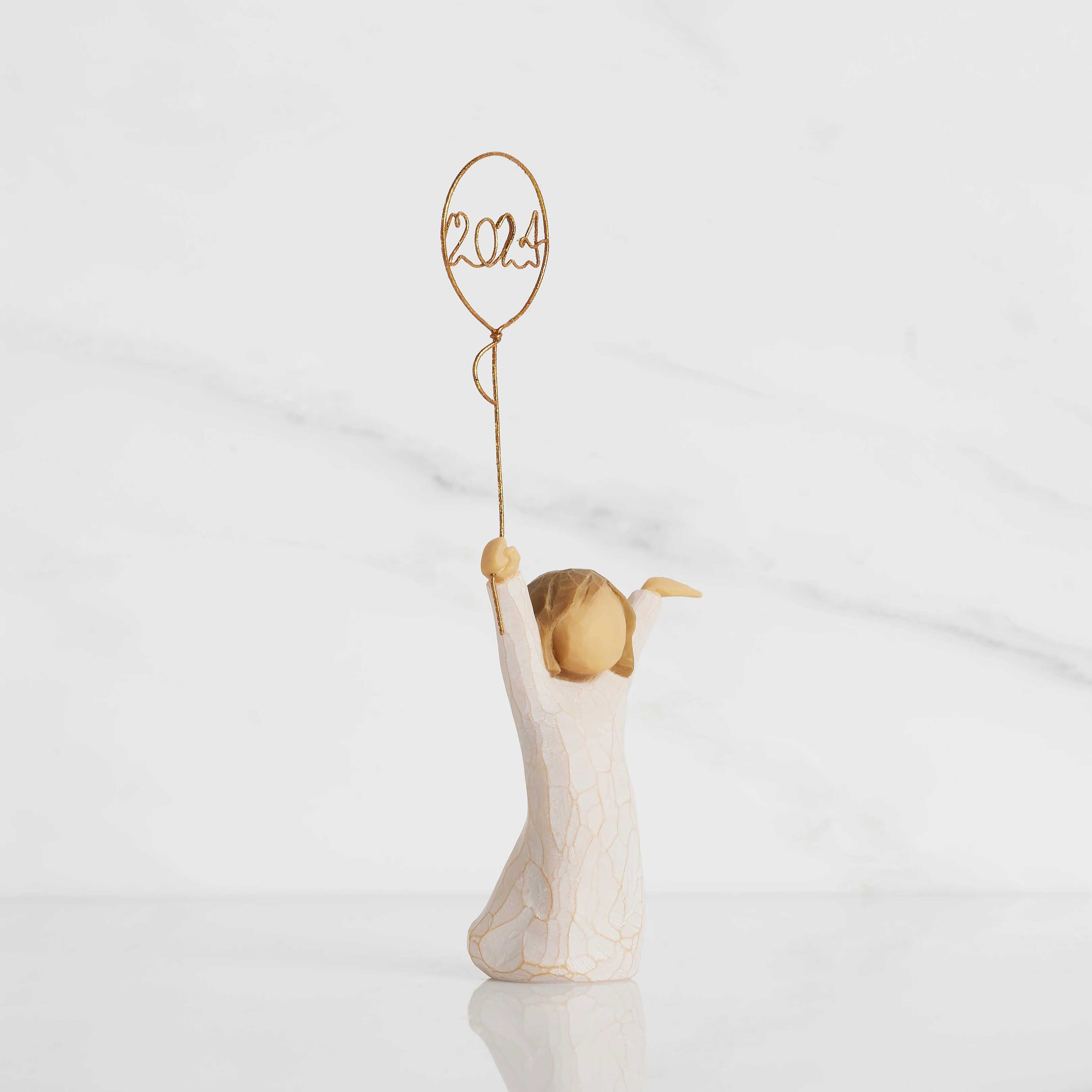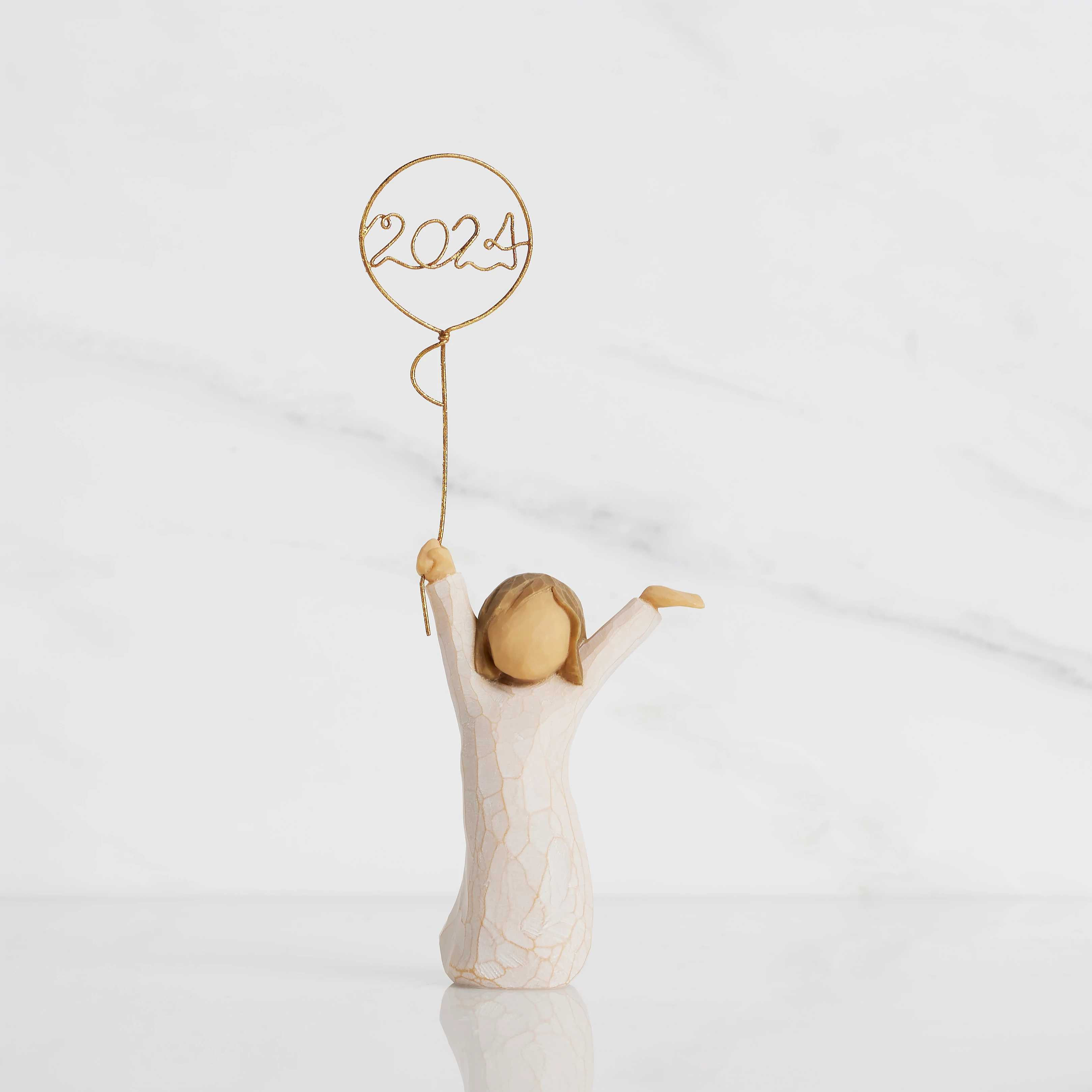 Holding a gold wire balloon framing the year 2024, she evokes a burst of optimism.